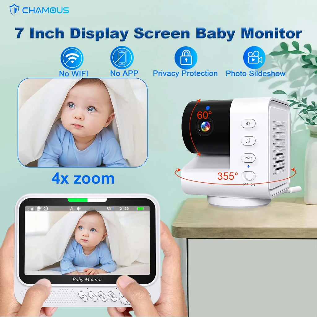 This wireless video baby monitor features a large 7-inch HD color display with 720p resolution, providing a clear and stable live feed of your baby. The camera pans 355° and tilts 60°, allowing you to monitor every corner of the room. Additionally, the 4x zoom function provides a detailed view of your child. The camera operates without Wi-Fi, transmitting over a secure 2.4 GHz channel with FHSS technology, ensuring privacy.