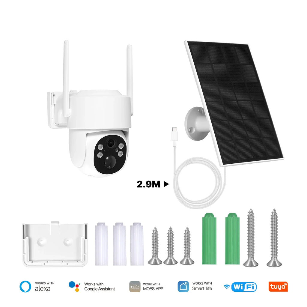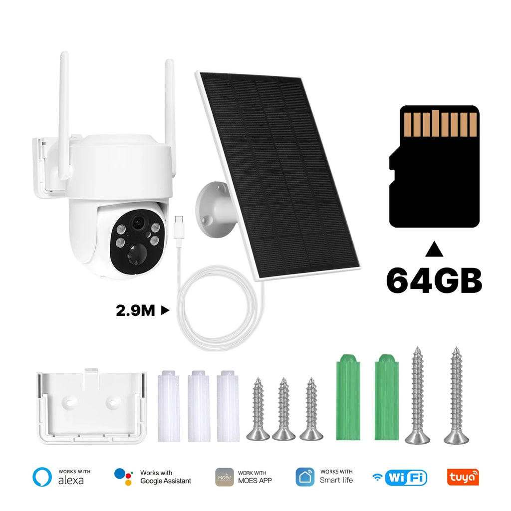 Die robuste ABS-Gehäuseschale entspricht der Schutzklasse IP65 und gewährleistet somit Schutz gegen Staub und Wasser, was sie ideal für den Einsatz im Außenbereich macht. Die Kamera ist kompatibel mit der Tuya Smart-Home-Plattform, wodurch eine einfache Integration in bestehende Smart-Home-Systeme möglich ist. Lokale Speicherung erfolgt über eine erweiterbare TF-Karte mit bis zu 128 GB Kapazität, zusätzlich ist Cloud-Speicherung möglich.