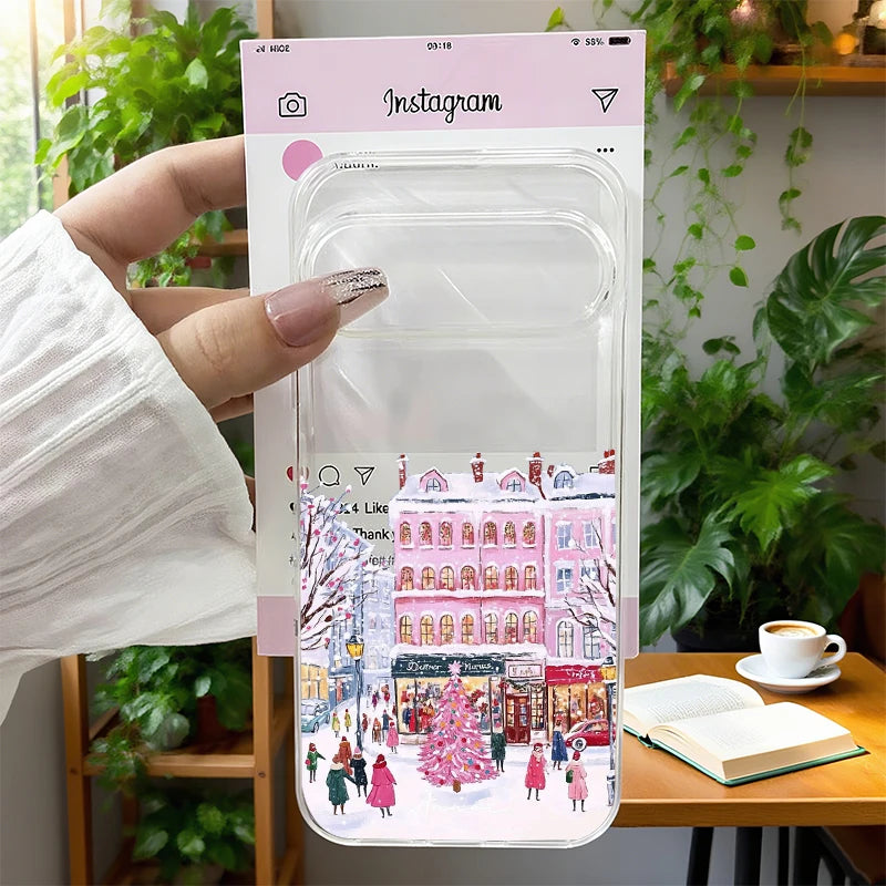 Das transparente Rückcover zeigt eine detaillierte Schneelandschaft mit verschneiten Straßen und festlicher Weihnachtsdekoration. Das Motiv verleiht deinem Pixel-Smartphone einen eleganten, saisonalen Look und macht es zum perfekten Accessoire für Winter- und Weihnachtszeit.