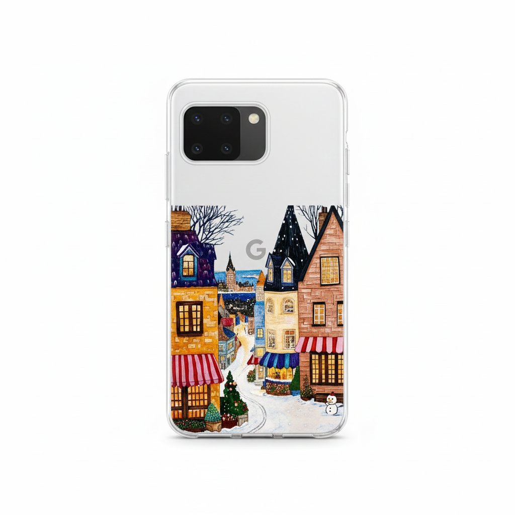 Das transparente Rückcover zeigt eine detaillierte Schneelandschaft mit verschneiten Straßen und festlicher Weihnachtsdekoration. Das Motiv verleiht deinem Pixel-Smartphone einen eleganten, saisonalen Look und macht es zum perfekten Accessoire für Winter- und Weihnachtszeit.