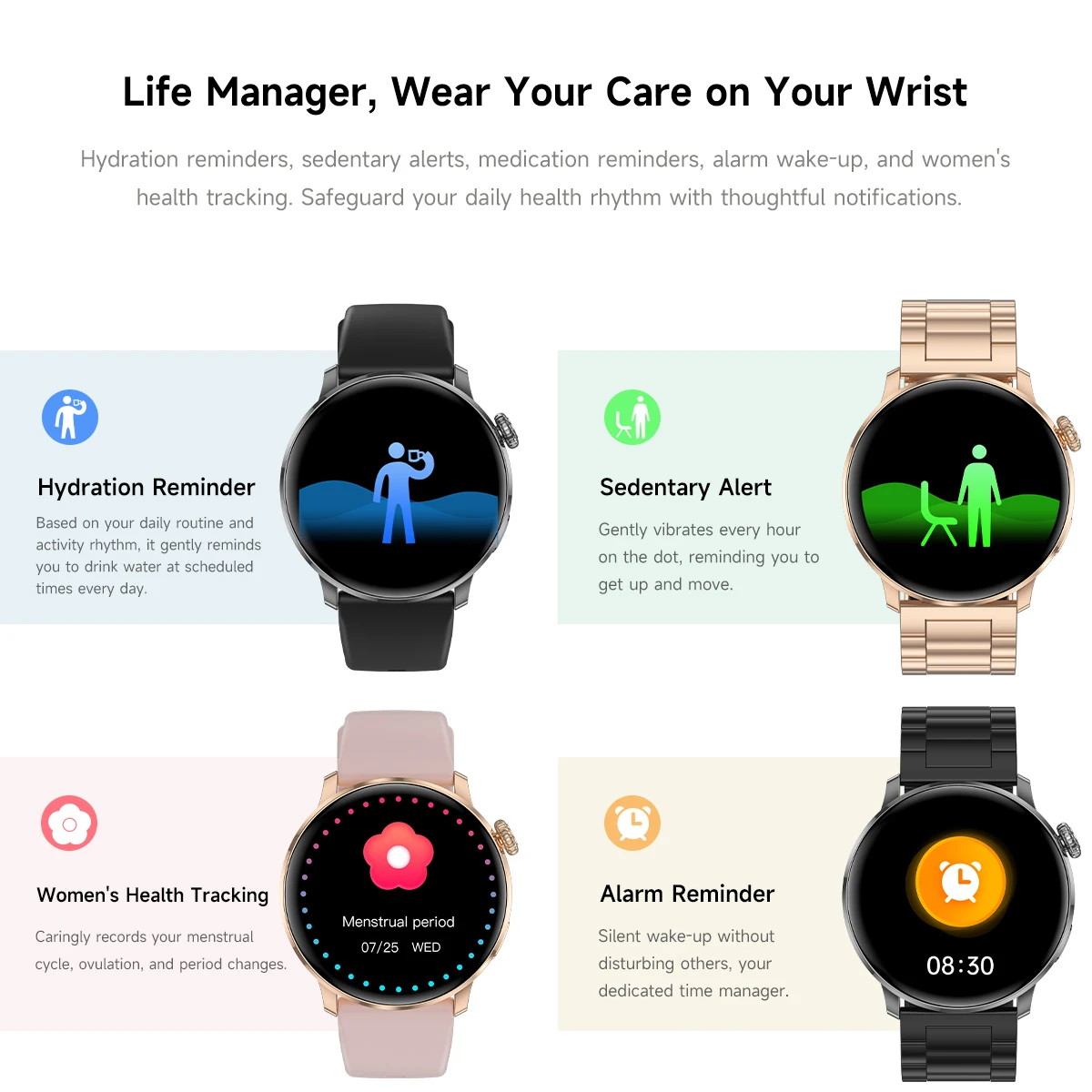Die Uhr ist stoßfest und bis zu 10 Meter wasserdicht, was sie perfekt für den Alltag und sportliche Aktivitäten macht. Die integrierte Sprachassistenz unterstützt zahlreiche Sprachen und erleichtert die Bedienung per Stimme. Das Design ist modern und modebewusst, was sie zum idealen Geschenk für Damen und Herren macht, die Wert auf Technologie und Eleganz legen.