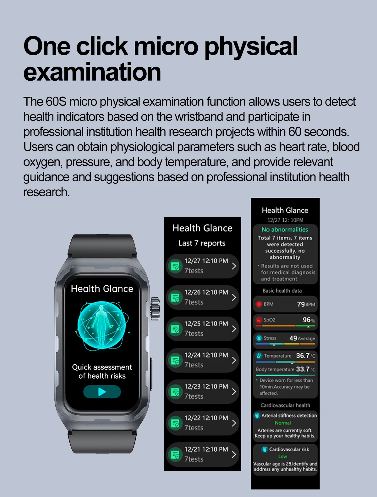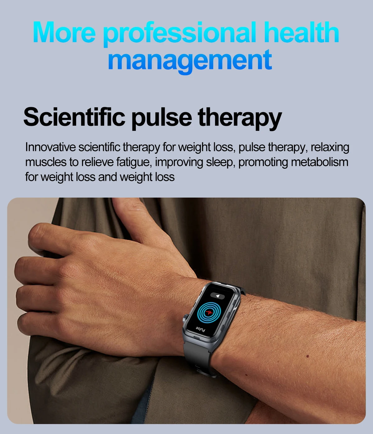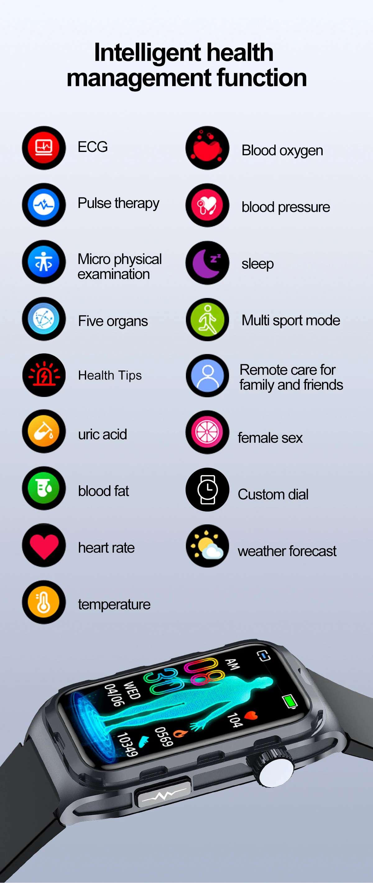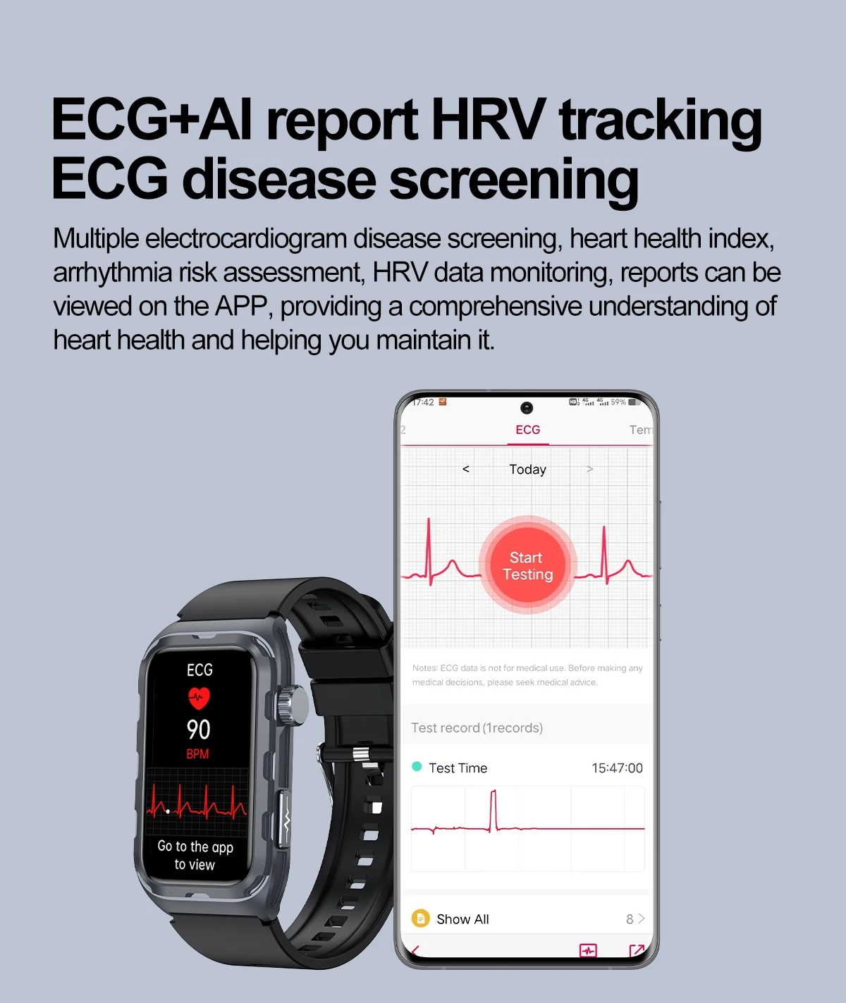 Die Uhr misst präzise wichtige Gesundheitswerte wie Blutdruck, Herzfrequenz, Blutsauerstoff, Körpertemperatur sowie Blutfett- und Harnsäurewerte. Die integrierte Elektrodiagrammfunktion (EKG) und Pulstherapie helfen dabei, das Herz gesund zu halten und Ermüdung zu lindern. Zusätzlich analysiert die Smartwatch Körperfett und BMI für ein umfassendes Gesundheitsmanagement.