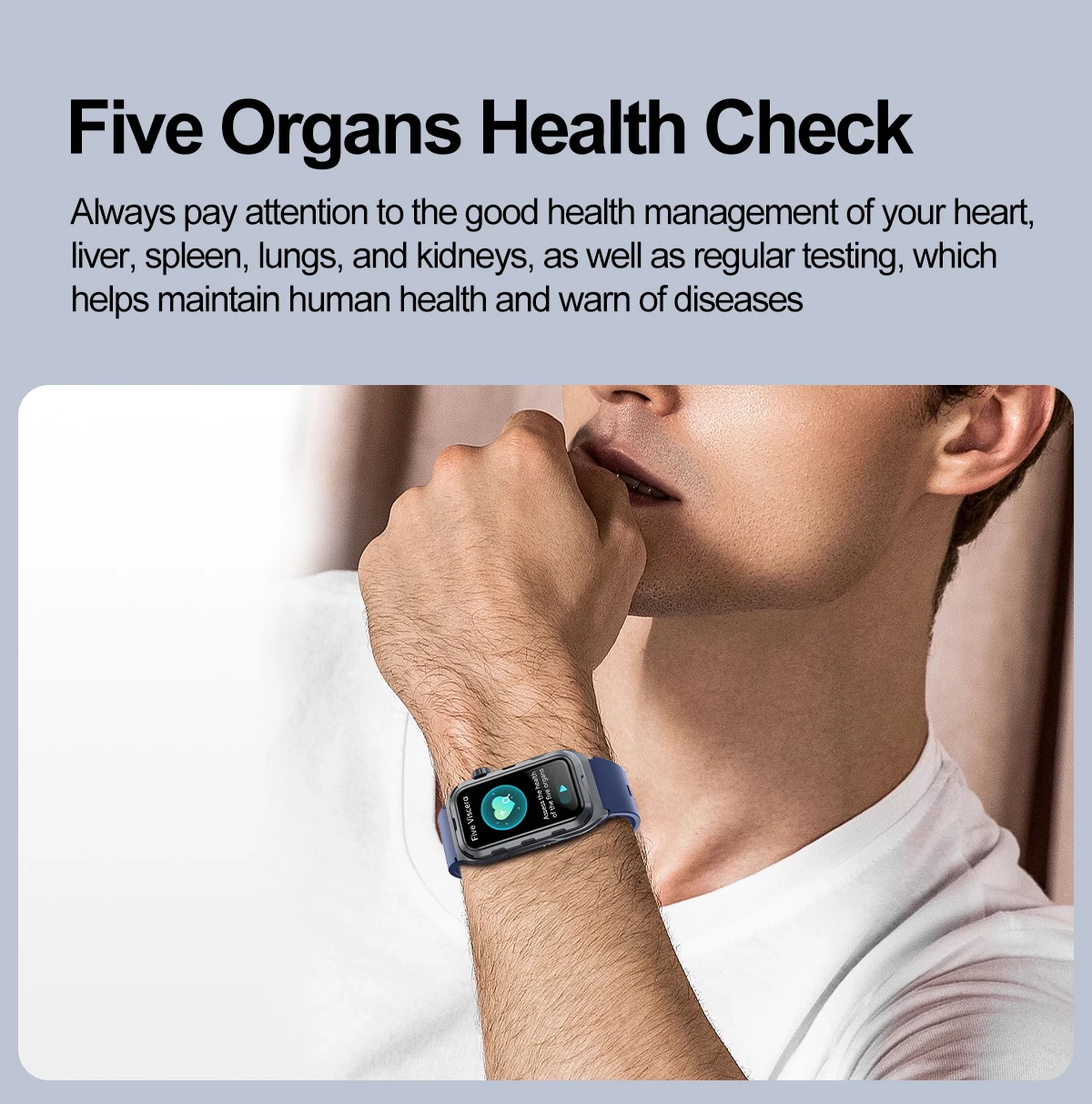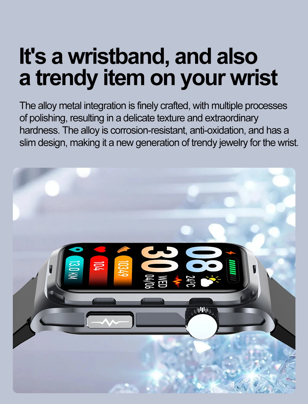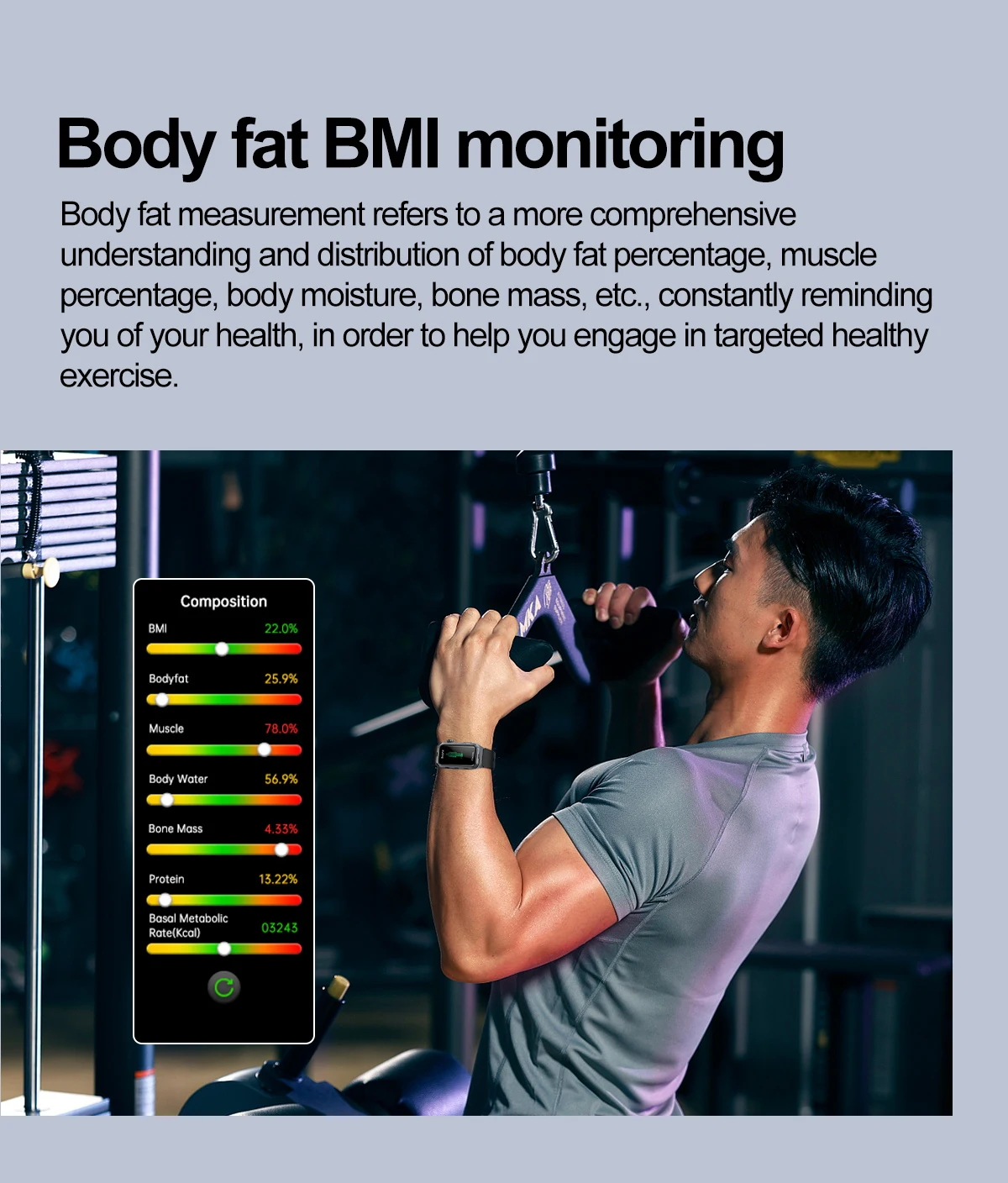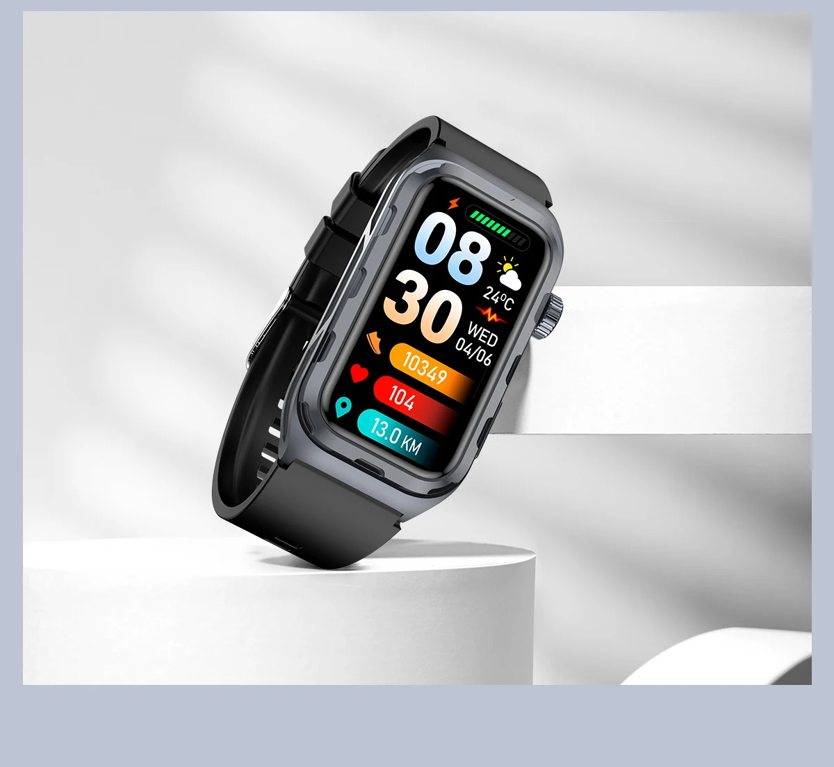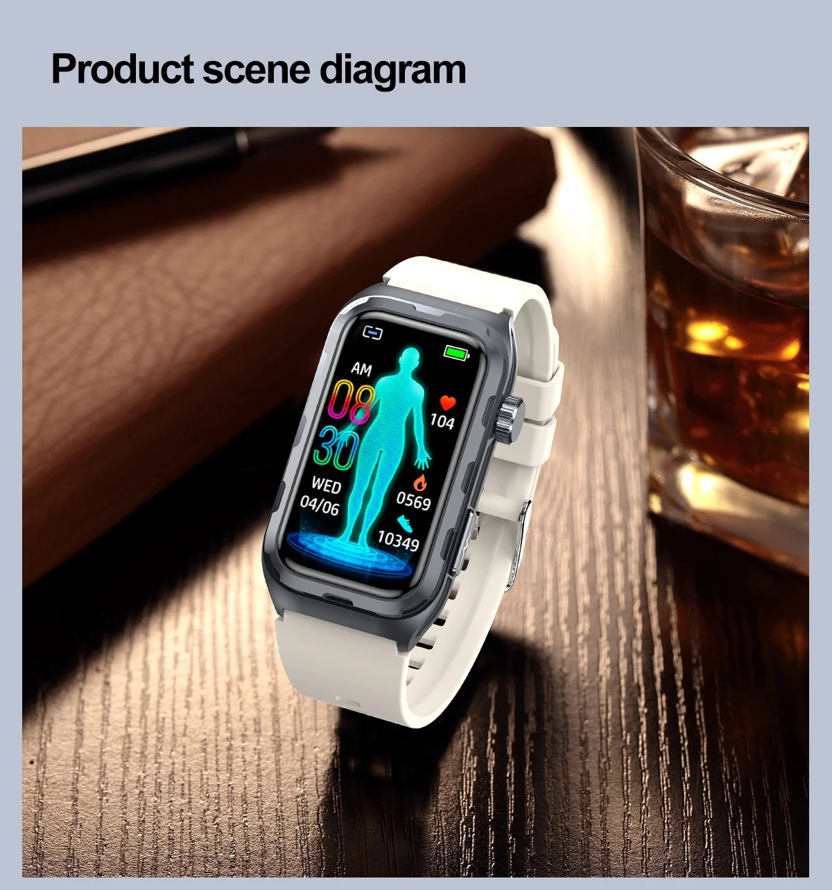 Die Uhr misst präzise wichtige Gesundheitswerte wie Blutdruck, Herzfrequenz, Blutsauerstoff, Körpertemperatur sowie Blutfett- und Harnsäurewerte. Die integrierte Elektrodiagrammfunktion (EKG) und Pulstherapie helfen dabei, das Herz gesund zu halten und Ermüdung zu lindern. Zusätzlich analysiert die Smartwatch Körperfett und BMI für ein umfassendes Gesundheitsmanagement.