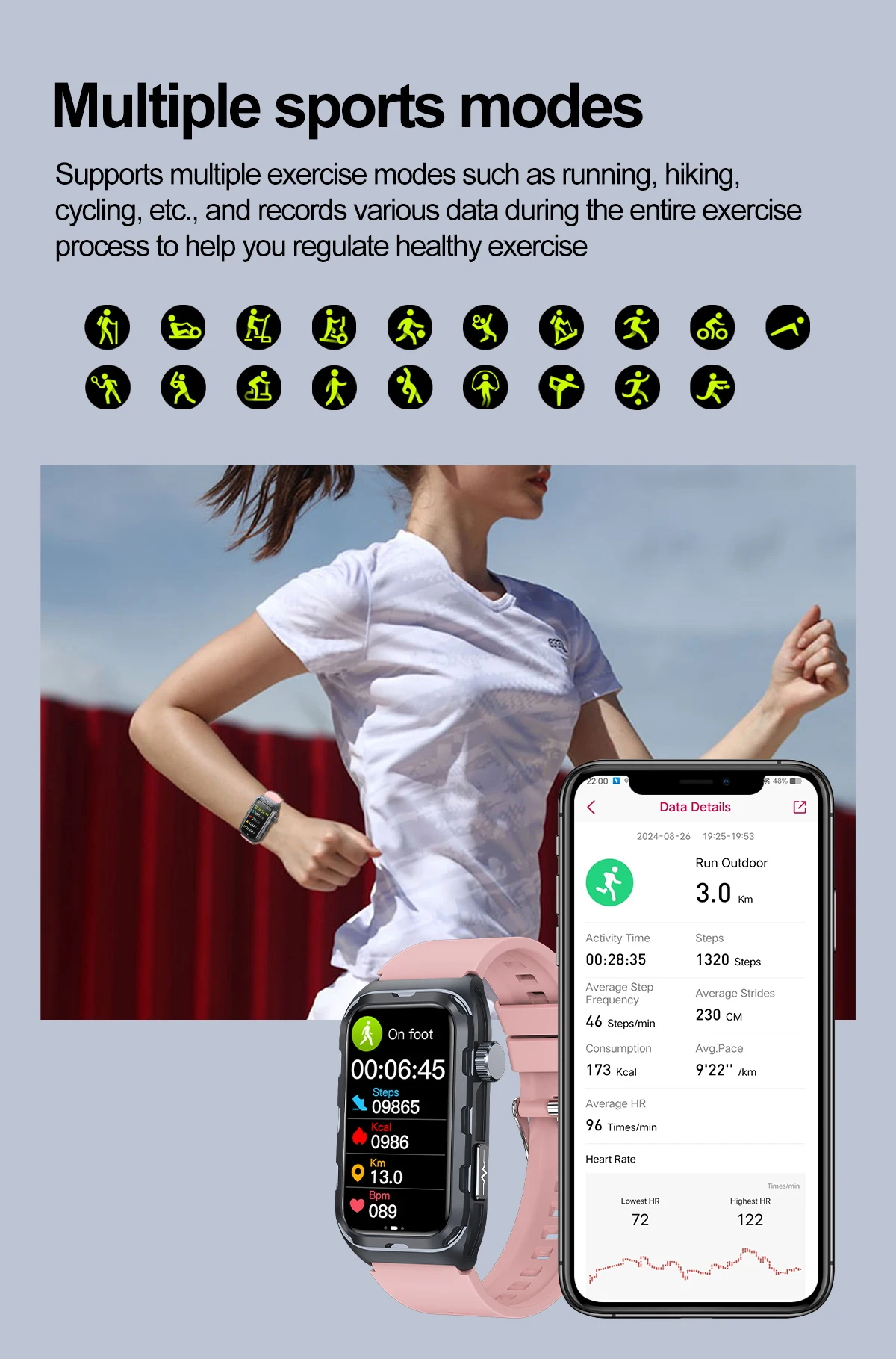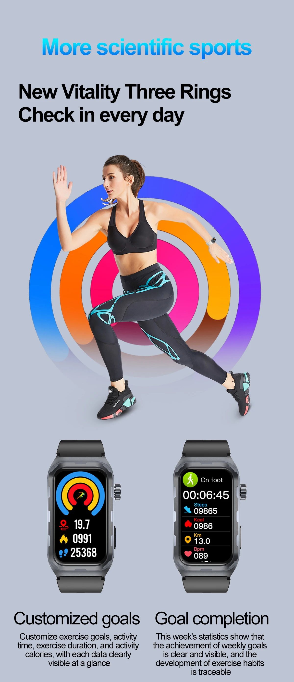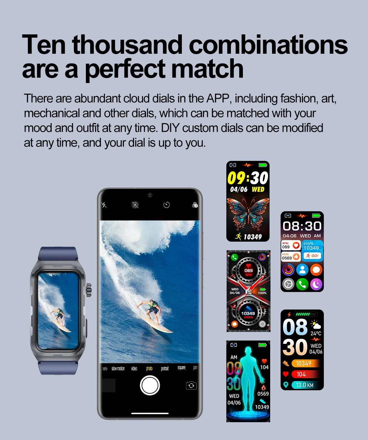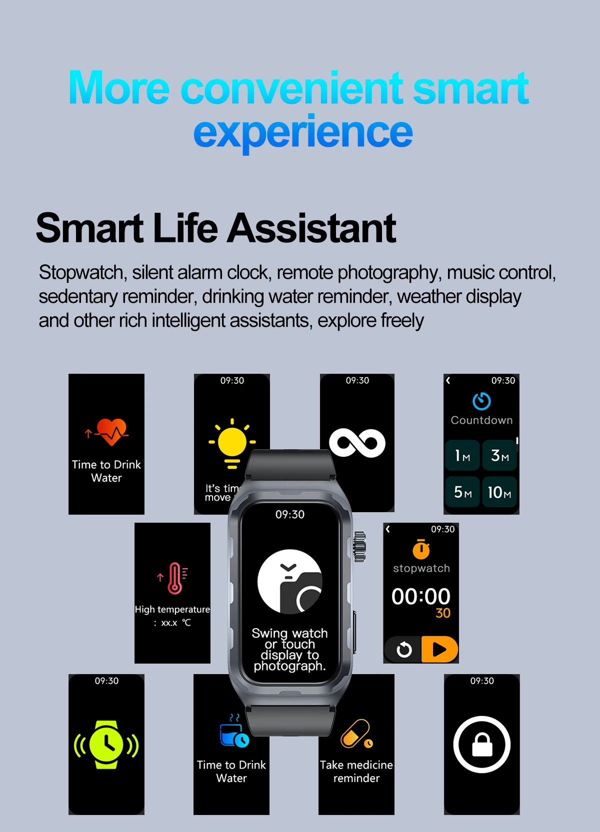 Die Uhr misst präzise wichtige Gesundheitswerte wie Blutdruck, Herzfrequenz, Blutsauerstoff, Körpertemperatur sowie Blutfett- und Harnsäurewerte. Die integrierte Elektrodiagrammfunktion (EKG) und Pulstherapie helfen dabei, das Herz gesund zu halten und Ermüdung zu lindern. Zusätzlich analysiert die Smartwatch Körperfett und BMI für ein umfassendes Gesundheitsmanagement.