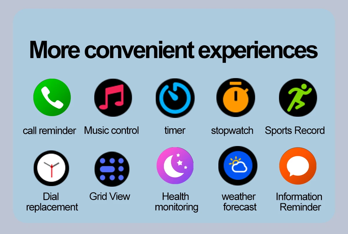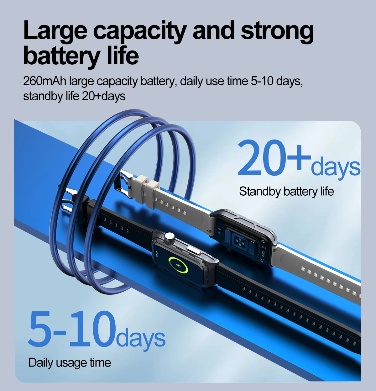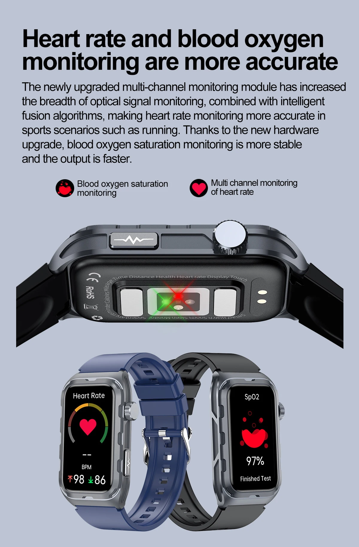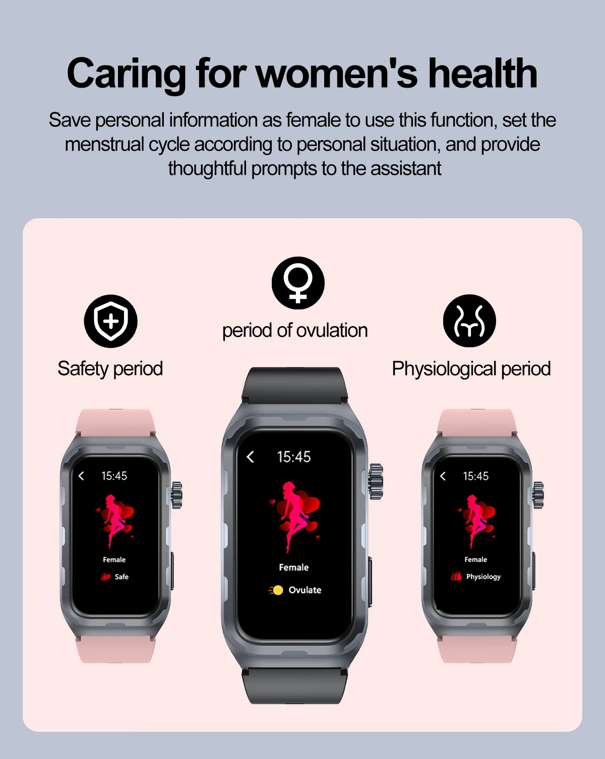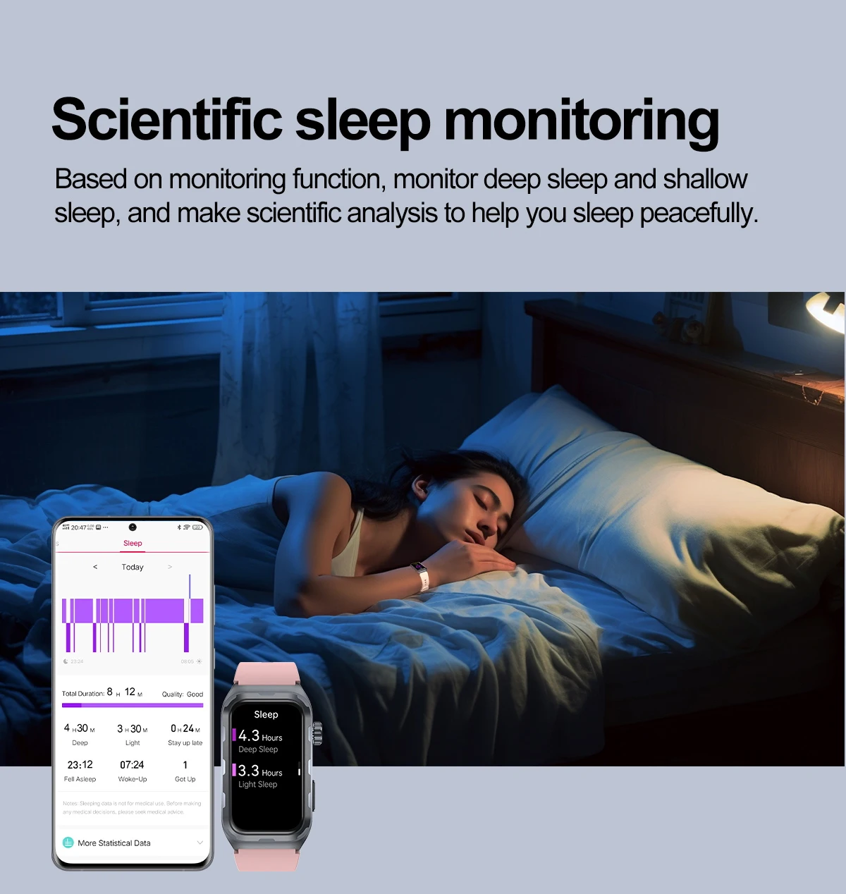 Die Uhr misst präzise wichtige Gesundheitswerte wie Blutdruck, Herzfrequenz, Blutsauerstoff, Körpertemperatur sowie Blutfett- und Harnsäurewerte. Die integrierte Elektrodiagrammfunktion (EKG) und Pulstherapie helfen dabei, das Herz gesund zu halten und Ermüdung zu lindern. Zusätzlich analysiert die Smartwatch Körperfett und BMI für ein umfassendes Gesundheitsmanagement.