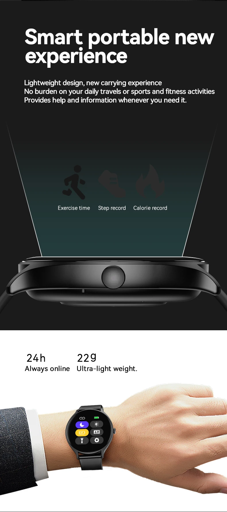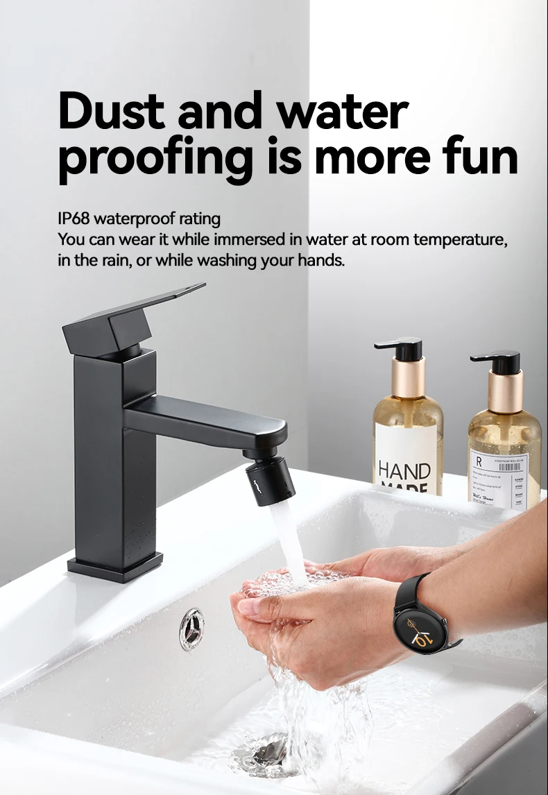Das runde Design mit einem robusten Gehäuse aus Legierung und einem komfortablen Silikonarmband (abnehmbar, 260 mm lang) macht die Uhr sowohl optisch ansprechend als auch langlebig. Die IP68-Wasserbeständigkeit schützt zuverlässig vor Schweiß, Spritzwasser und Regen – ideal für den täglichen Einsatz.