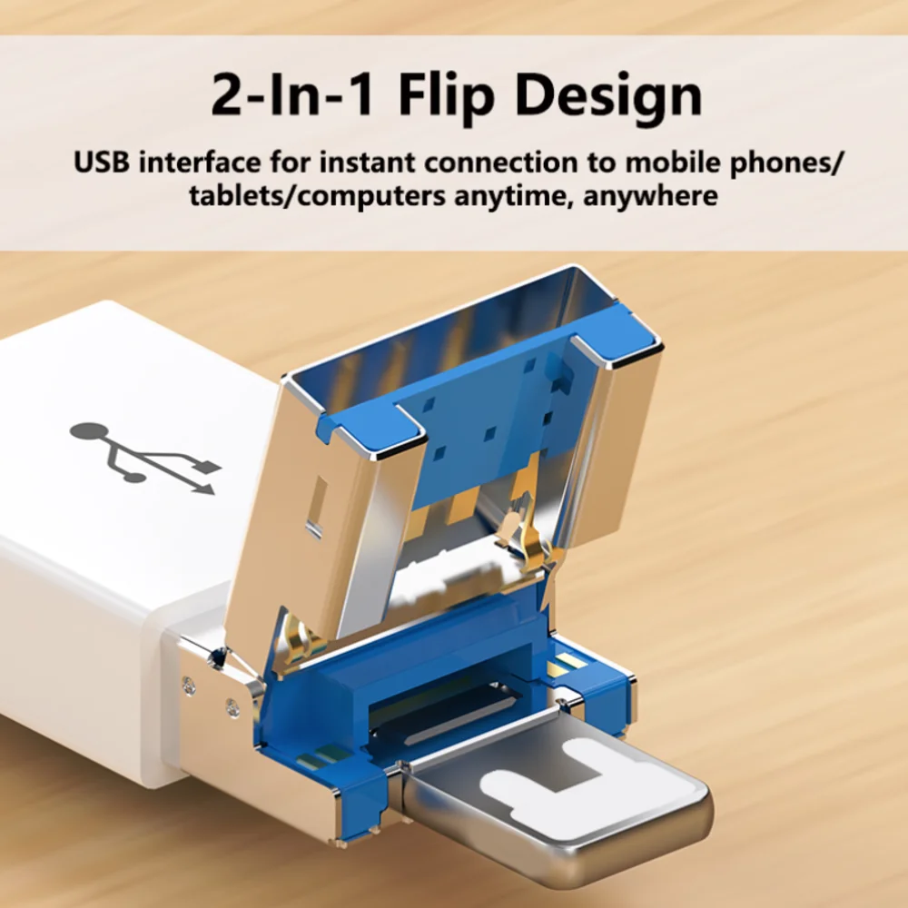 Dieser 2in1 Flip Design USB Lightning zu SD TF Kartenleser ist ein hochfunktionaler Adapter für iPhone und iPad, der sowohl Datenübertragung als auch Aufladen in einem Gerät kombiniert. Das Flip-Design ermöglicht es, zwischen Lightning- und USB-Anschluss flexibel zu wechseln, ohne zusätzliche Adapter. Mit dem Kartenleser können Sie SD- und TF-Karten direkt auf Ihrem iOS-Gerät lesen und schreiben, wodurch Fotos, Videos, Musik und andere Dateien schnell und effizient übertragen werden können.