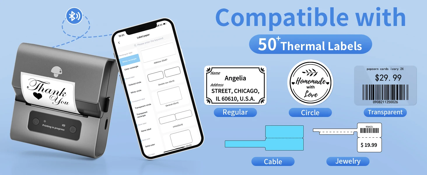 Der Phomemo M221 3‑Zoll Bluetooth Etikettendrucker ist bestens geeignet für kleine Unternehmen und das Heimbüro. Mit einer Druckbreite von 20–75 mm und einer Auflösung von 203 dpi bietet er flexible Einsatzmöglichkeiten – von Adress‑ und Barcodeetiketten bis zu Produkt‑, Kabel‑ oder Schmuckaufklebern. Die Verbindung erfolgt stabil über Bluetooth 4.2 (innerhalb von ca. 2 Sekunden verbunden), zusätzlich ist eine USB‑Schnittstelle für Mac und Windows eingebaut.
