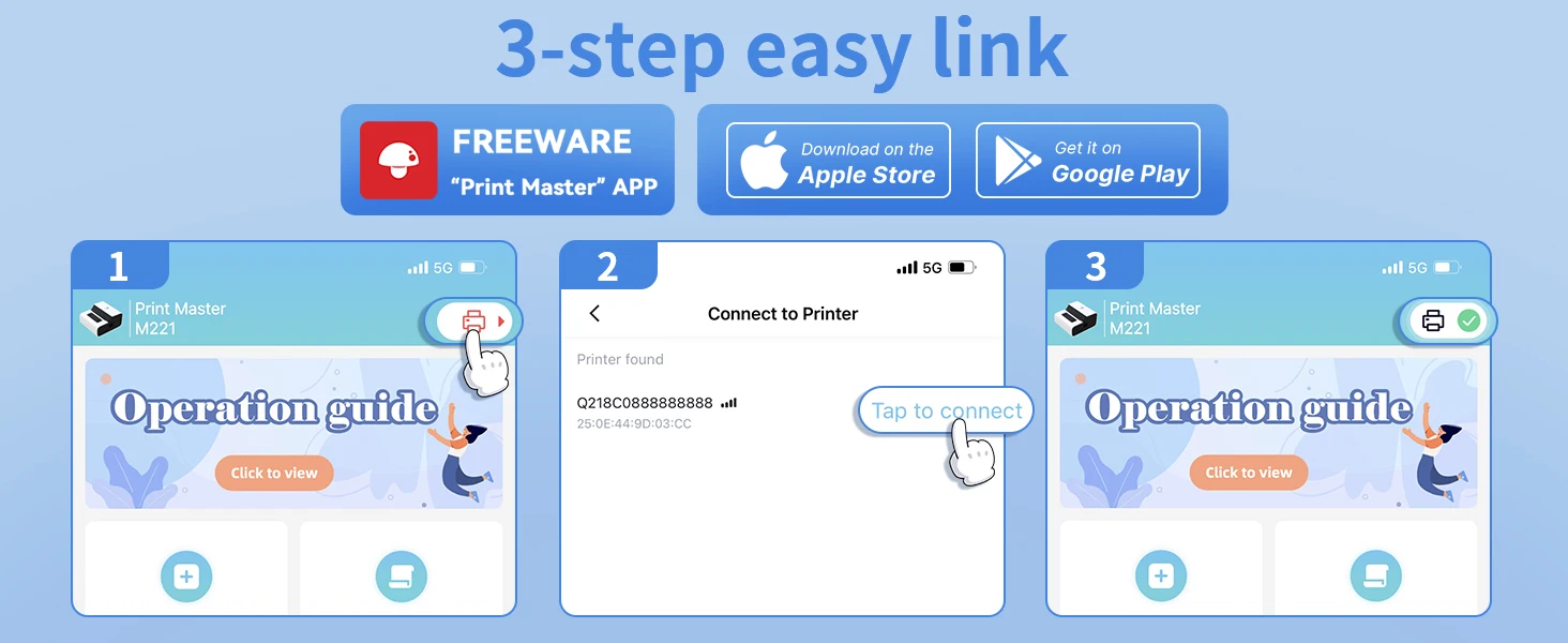 Der integrierte 2200 mAh Lithiumakku erlaubt den Druck von bis zu 36 Rollen (bei vollständiger Ladung). Laden erfolgt schnell über USB‑C mit 5 V / 2 A. Der Druckkopf hat eine Lebensdauer von bis zu 50 km Druckbahn. Die Thermodrucktechnologie erspart den Einsatz von Tinten oder Toner – nur Thermopapier wird benötigt. Die mitgelieferte Print Master App bietet über 100 Vorlagen und 13 Sprachen, um Texte, Barcodes, Symbole und Bilder zu gestalten. Der M221 unterstützt sowohl automatischen als auch manuellen Papiereinzug und druckt mit einer Geschwindigkeit von 35–50 mm/s.