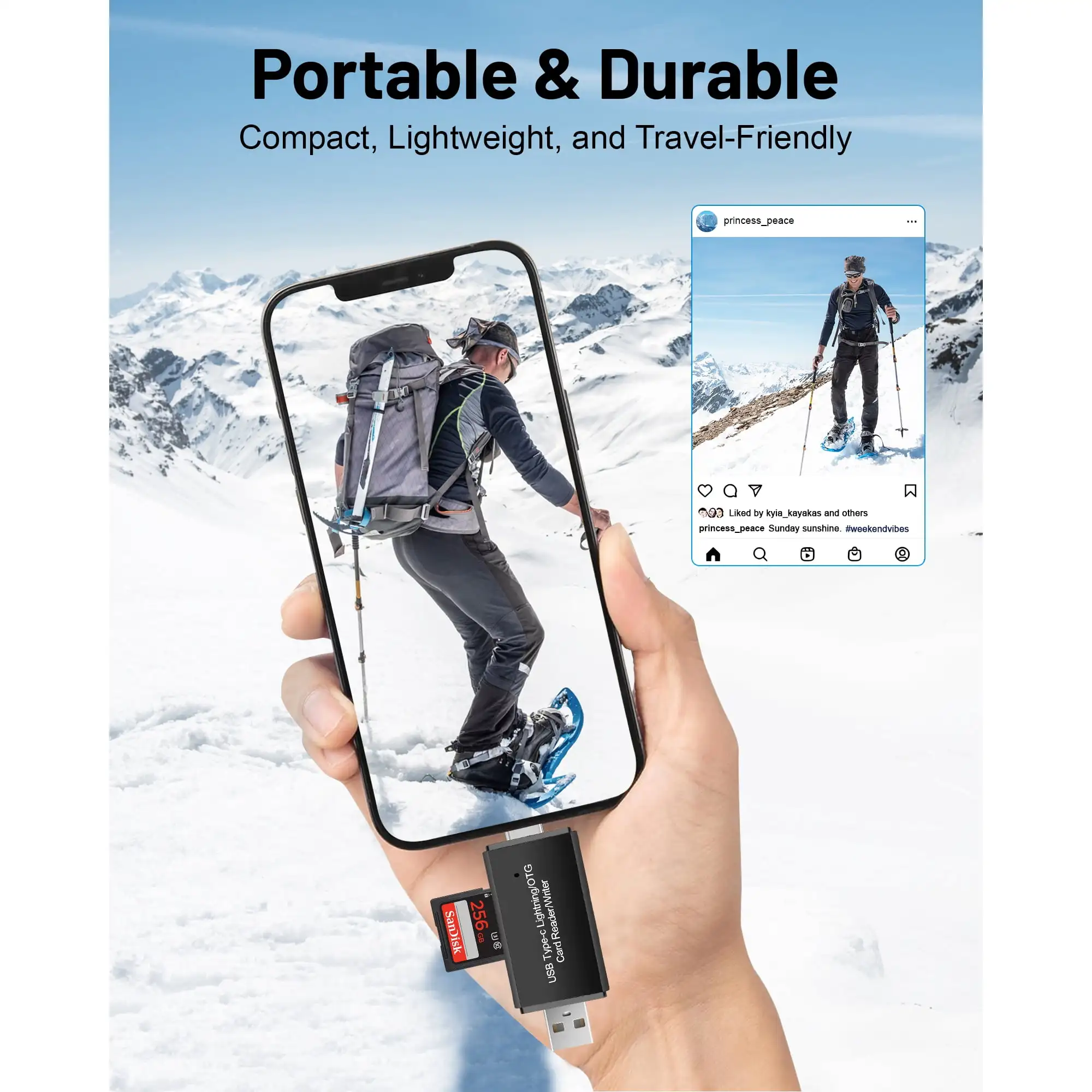 Das kompakte und langlebige Gehäuse aus mattschwarzem ABS ist ideal für Reisen und den täglichen Gebrauch. Egal, ob Sie unterwegs Inhalte bearbeiten oder zu Hause Dateien organisieren, der Kartenleser passt bequem in Tasche oder Rucksack.