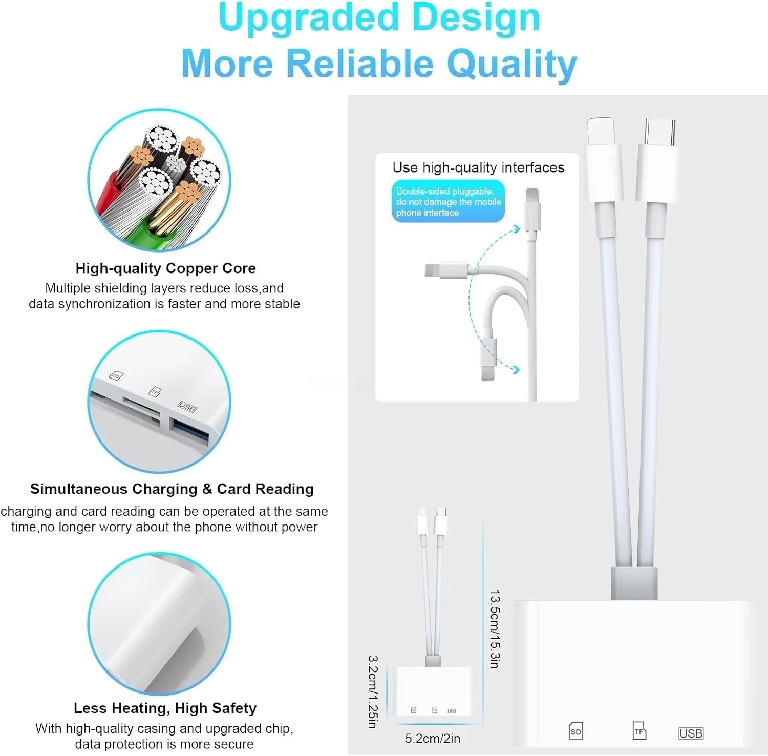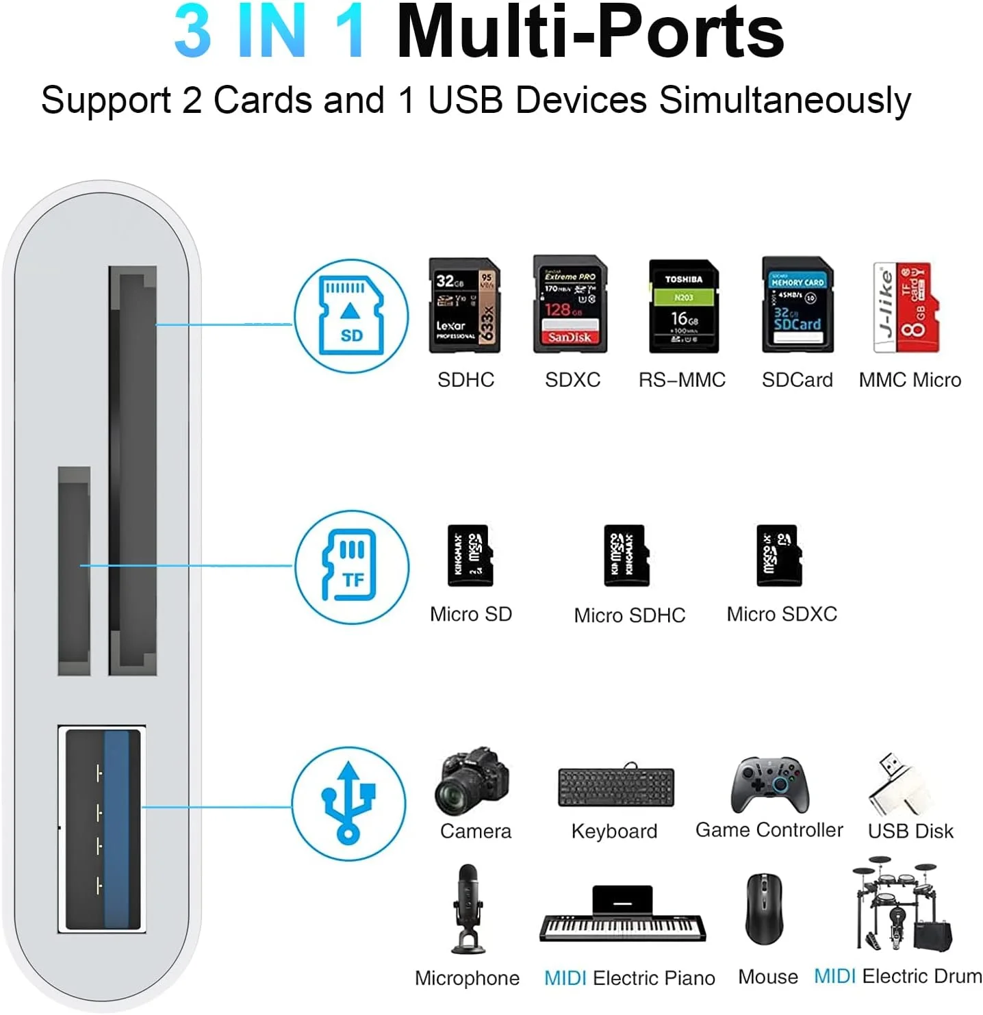 Der Adapter kann gleichzeitig mehrere Speicherkarten lesen und schreiben, sodass Dateien einfach überprüft, gesichert oder übertragen werden können. Mit der Plug-and-Play-Funktion ist keine zusätzliche Software erforderlich. Der Kartenleser unterstützt Hochgeschwindigkeitsübertragungen, wodurch Fotos, Videos, Dokumente und andere Dateien schnell zwischen Geräten bewegt werden können.