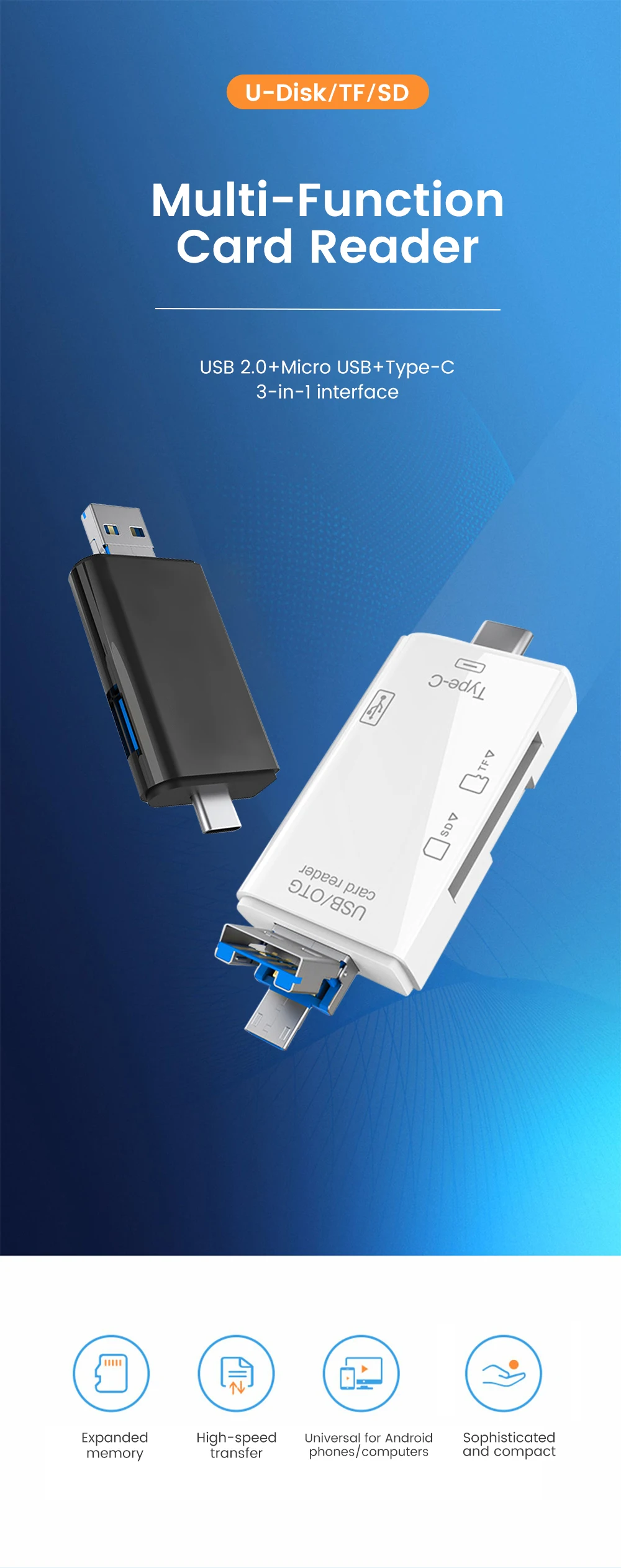 Produktmerkmale: USB2.0-Stecker, Micro-Stecker, Typ-C-Stecker, TF-Karte Hochgeschwindigkeitslesen, USB-Buchse für externe Geräte