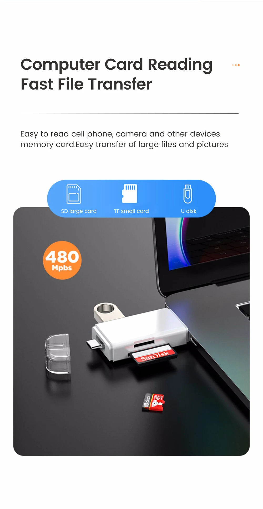 Der Kartenleser verfügt über einen Klapp- und Stretchkopf, der die Anschlüsse USB 2.0, Micro-USB und Typ-C kombiniert. So ist er kompatibel mit Mobiltelefonen, MacBooks (USB Typ-C), Google Notebooks und gewöhnlichen Windows-Computern. Das Gehäuse besteht aus umweltfreundlichem ABS-Material, das robust und langlebig ist, während die kompakte Größe von 7,3 * 1,8 * 0,9 cm ihn ideal für unterwegs macht.