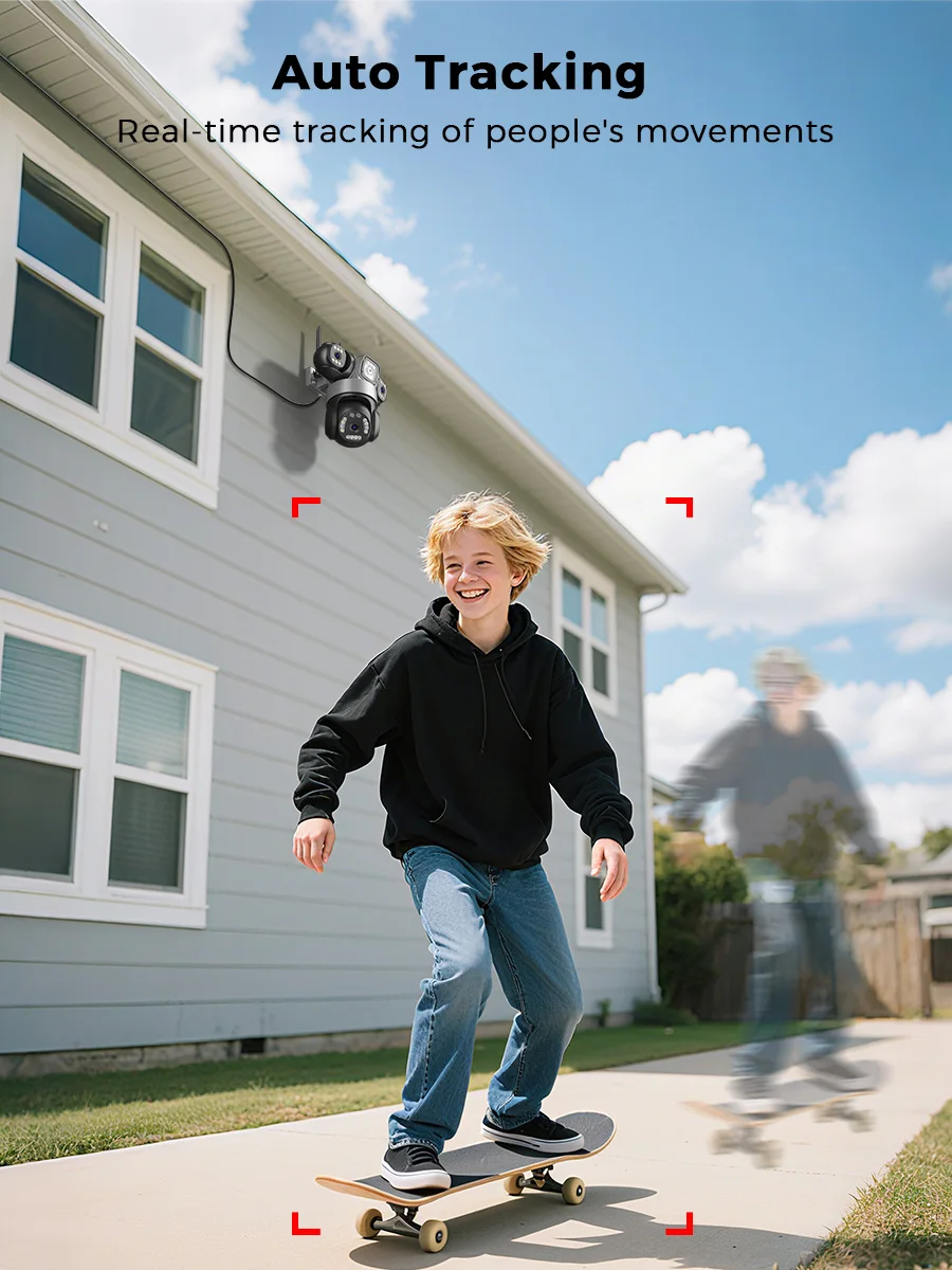 Die intelligente KI-basierte Bewegungserkennung erkennt menschliche Bewegungen präzise und löst bei Bedarf sofort Alarme aus, wodurch Fehlalarme minimiert werden. Die Auto-Tracking-Funktion folgt automatisch bewegten Objekten. Mit dem integrierten Zwei-Wege-Audio können Sie jederzeit über die Kamera hören und sprechen, ideal für die Kommunikation mit Familienmitgliedern oder zur Abschreckung unerwünschter Gäste.