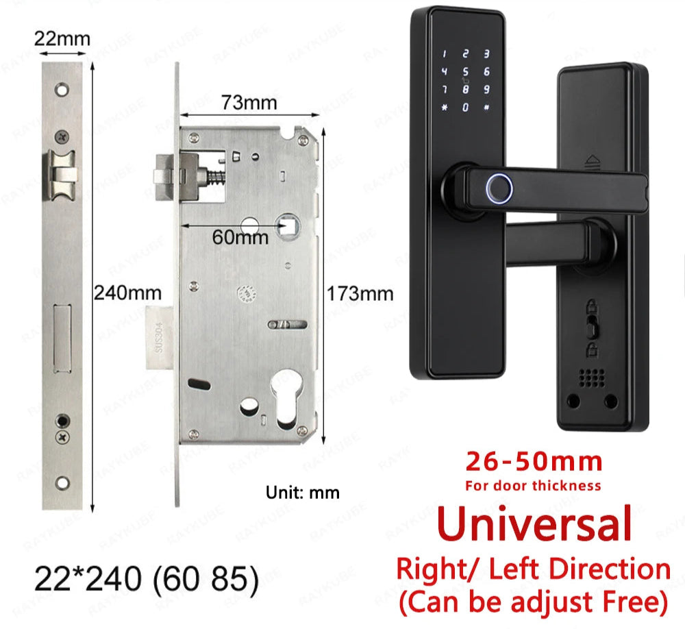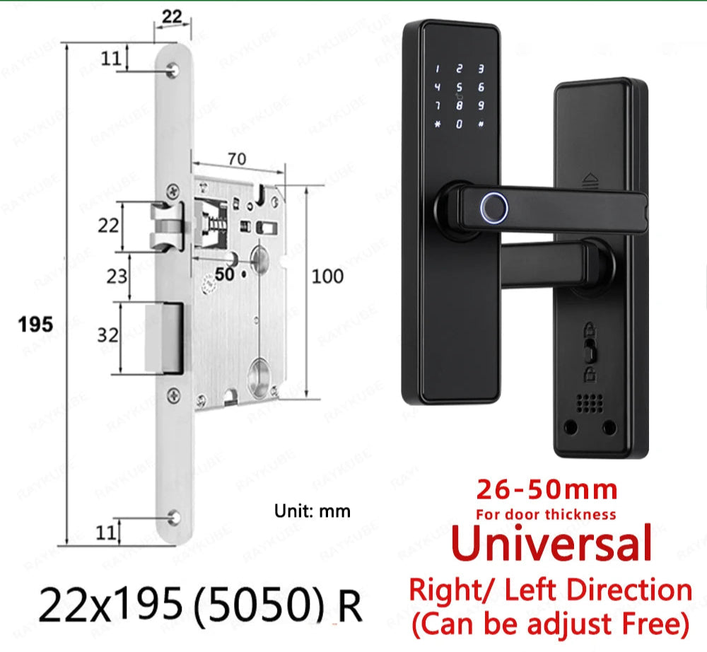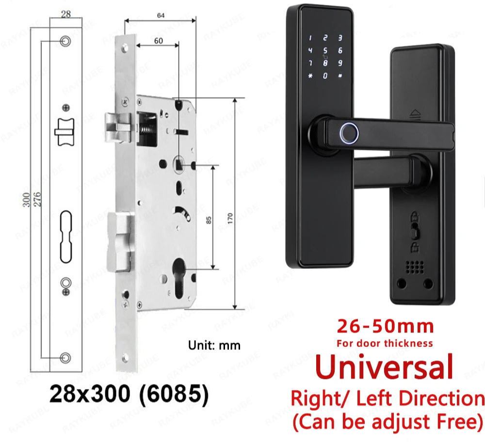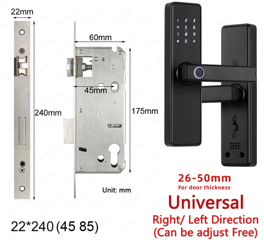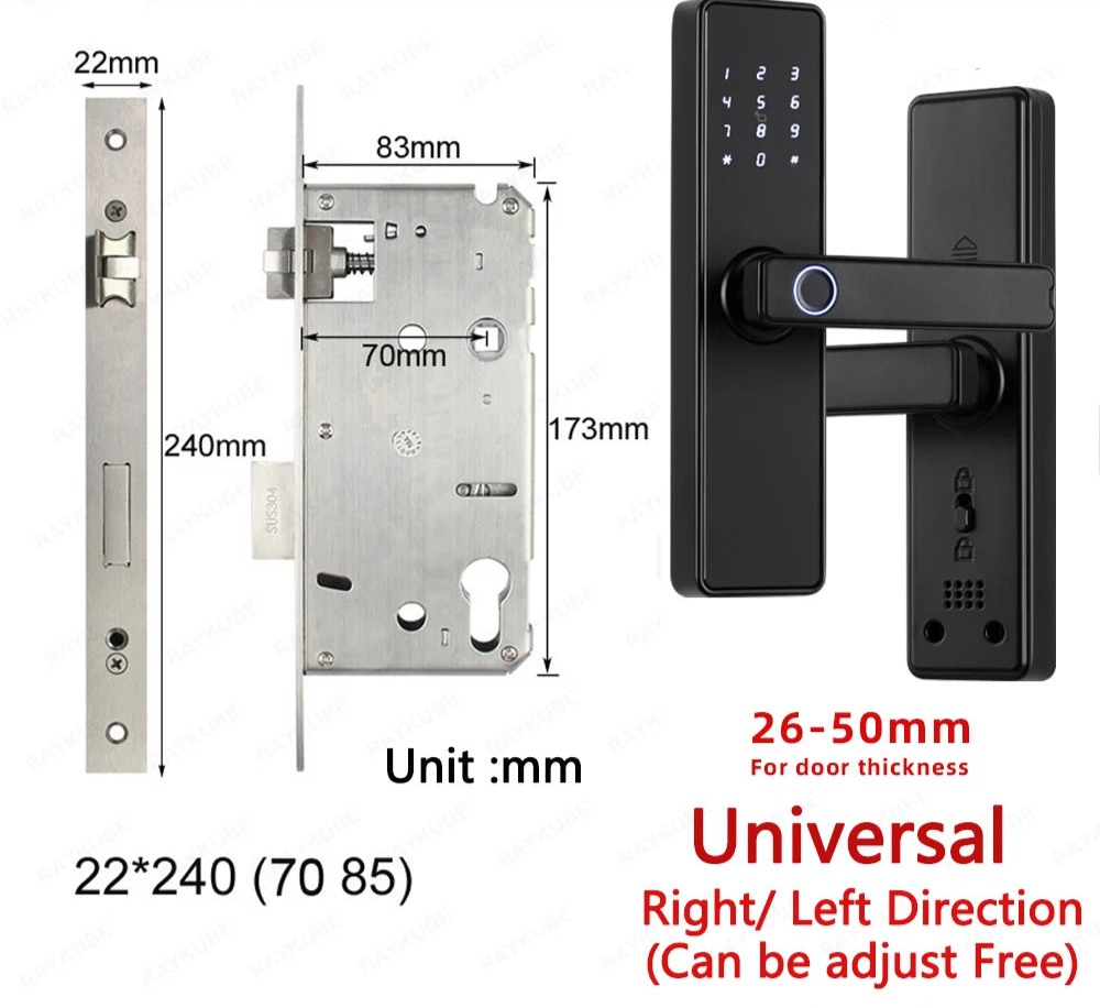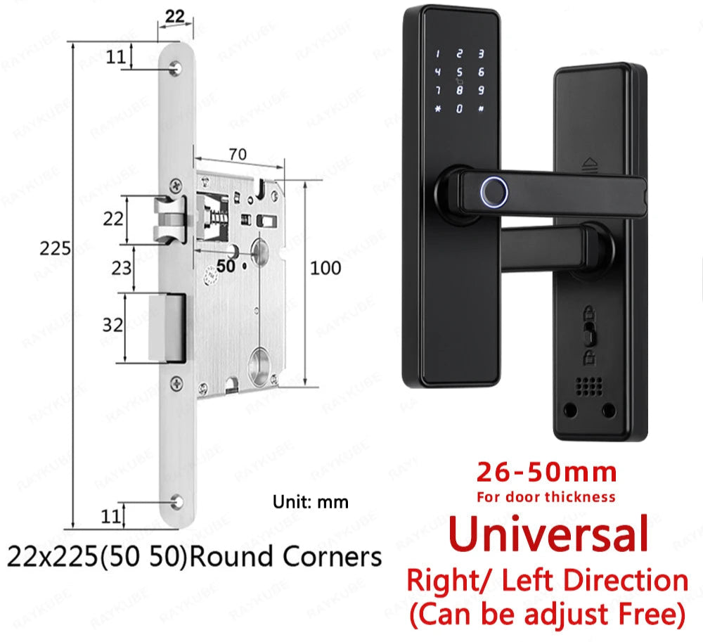 Das Schloss ist aus robustem Zinklegierungsmaterial gefertigt und für Türen mit einer Dicke von 26 bis 50 mm geeignet. Die Griffrichtung ist reversibel, sodass das Schloss sowohl für links- als auch für rechtsanschlagende Türen verwendet werden kann. Die Stromversorgung erfolgt über trockene Batterien, wodurch eine einfache und flexible Installation gewährleistet ist.