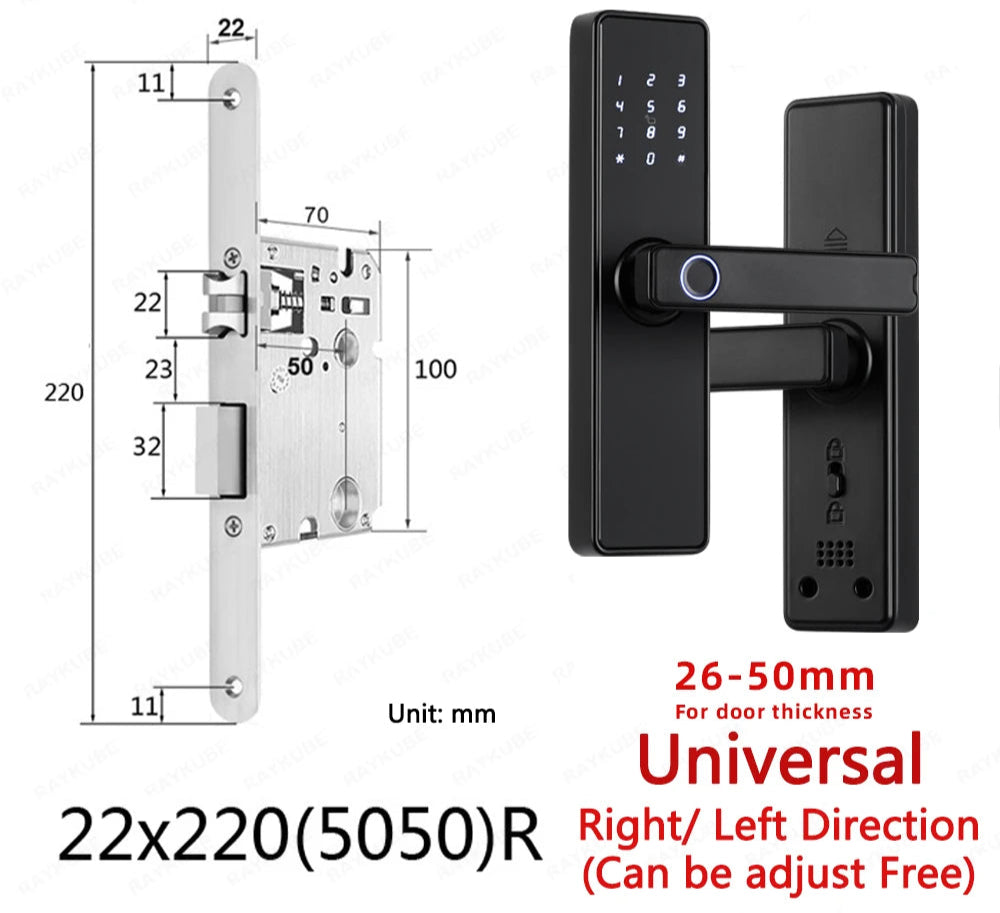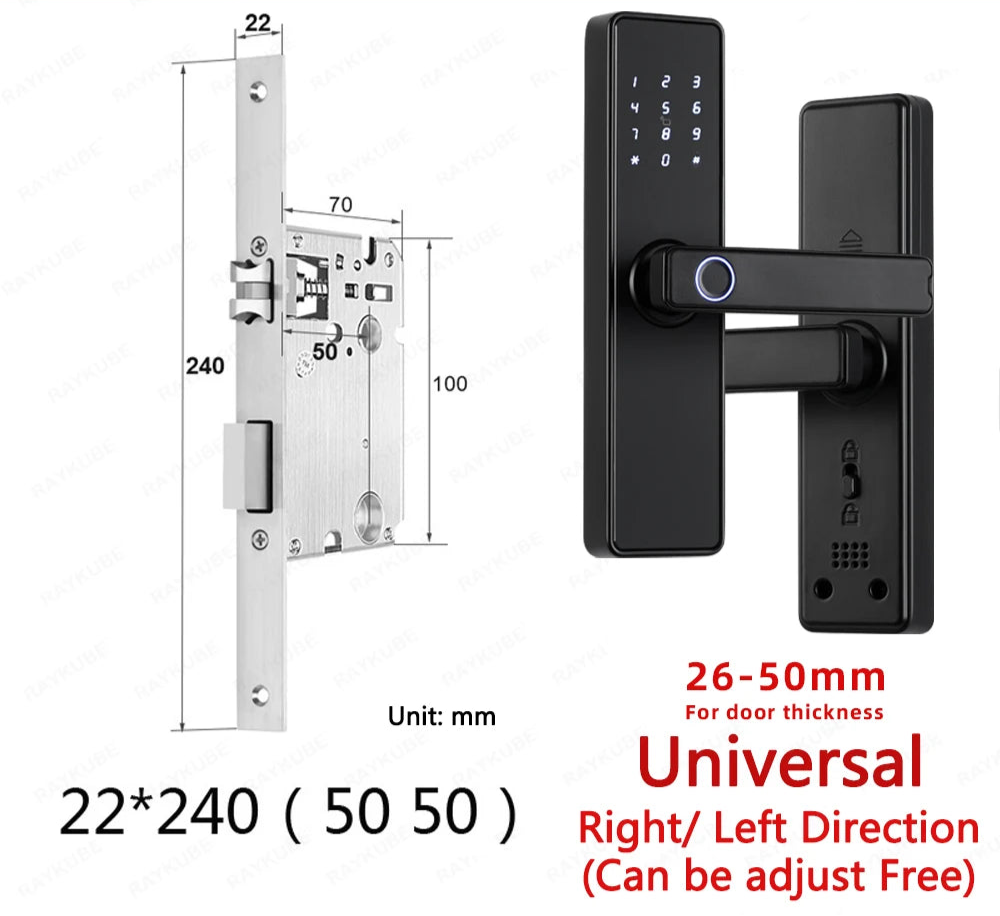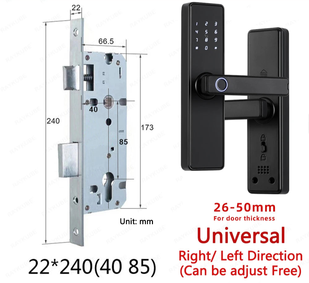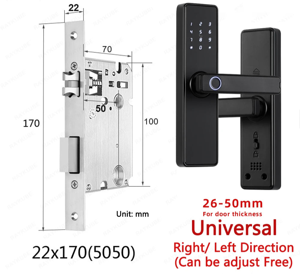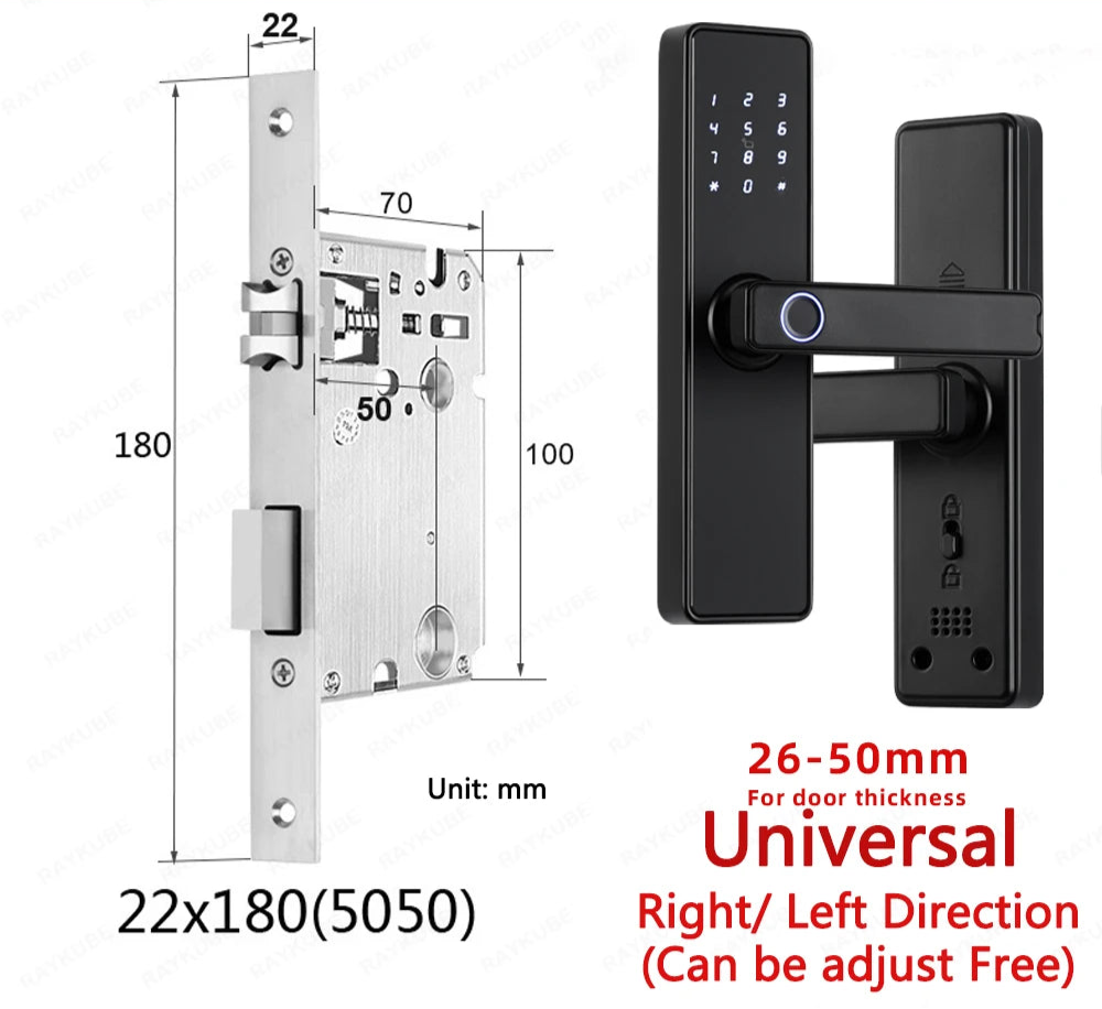 Das Schloss ist aus robustem Zinklegierungsmaterial gefertigt und für Türen mit einer Dicke von 26 bis 50 mm geeignet. Die Griffrichtung ist reversibel, sodass das Schloss sowohl für links- als auch für rechtsanschlagende Türen verwendet werden kann. Die Stromversorgung erfolgt über trockene Batterien, wodurch eine einfache und flexible Installation gewährleistet ist.