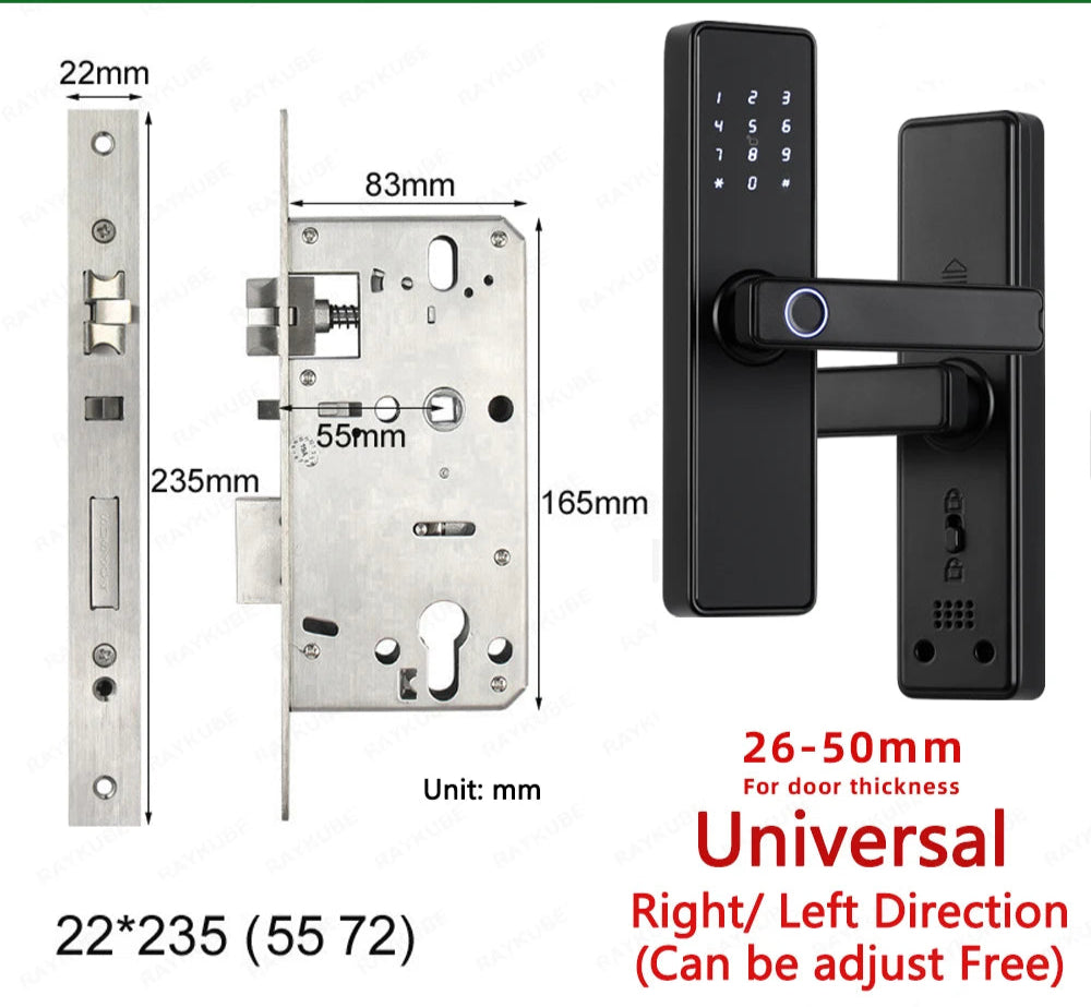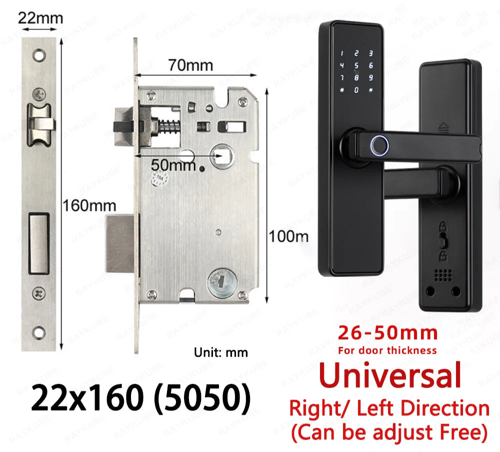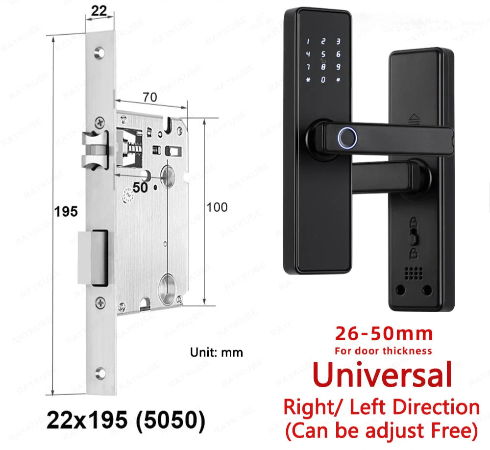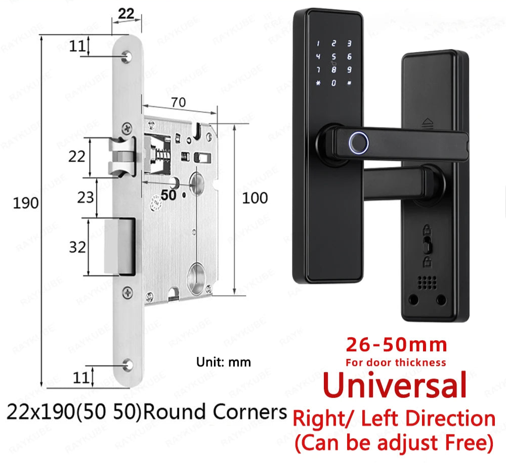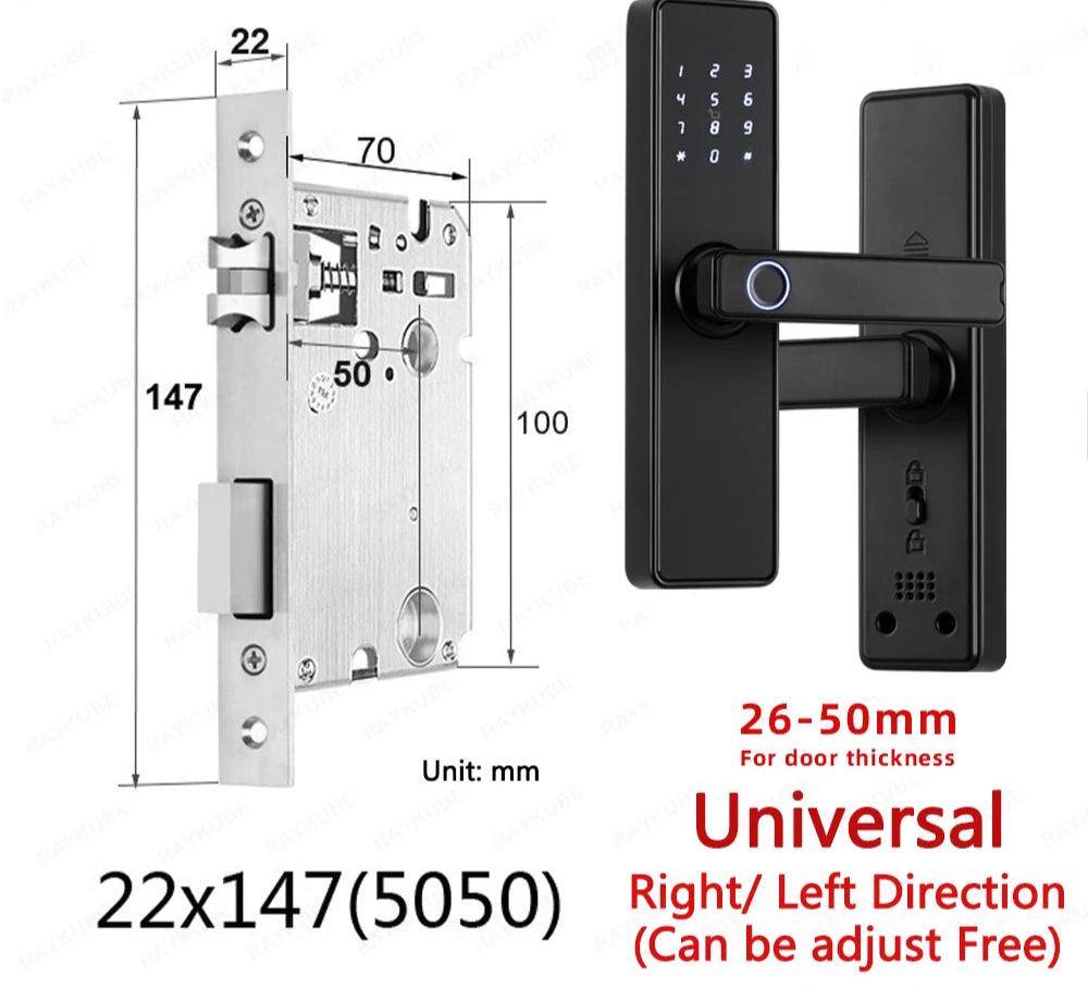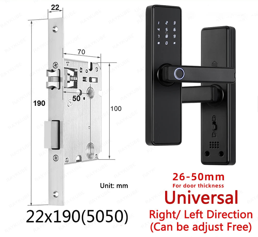 Das Schloss ist aus robustem Zinklegierungsmaterial gefertigt und für Türen mit einer Dicke von 26 bis 50 mm geeignet. Die Griffrichtung ist reversibel, sodass das Schloss sowohl für links- als auch für rechtsanschlagende Türen verwendet werden kann. Die Stromversorgung erfolgt über trockene Batterien, wodurch eine einfache und flexible Installation gewährleistet ist.