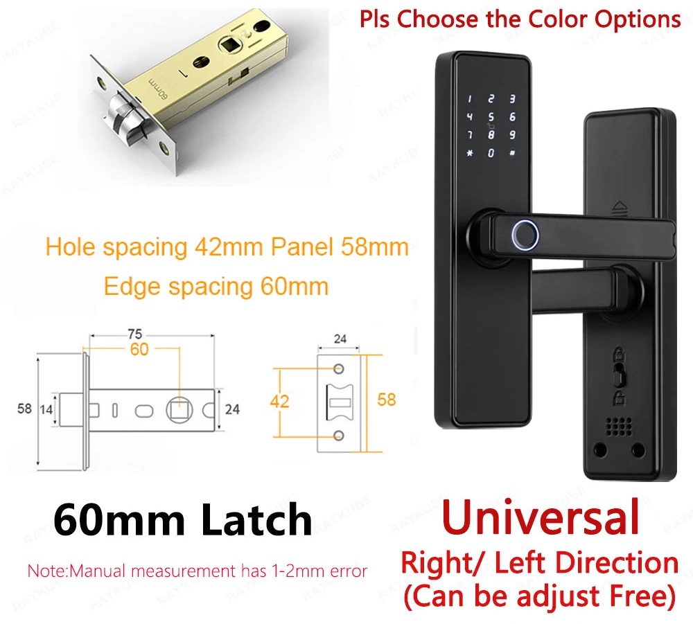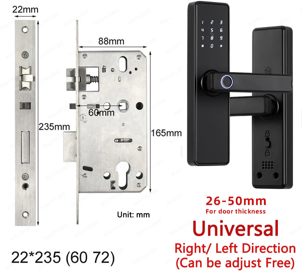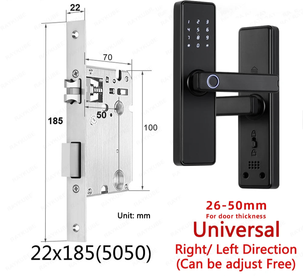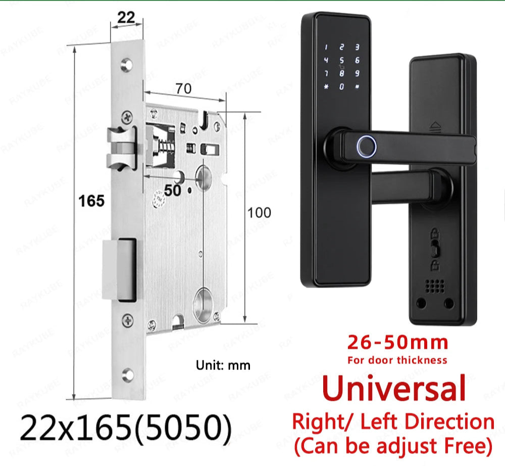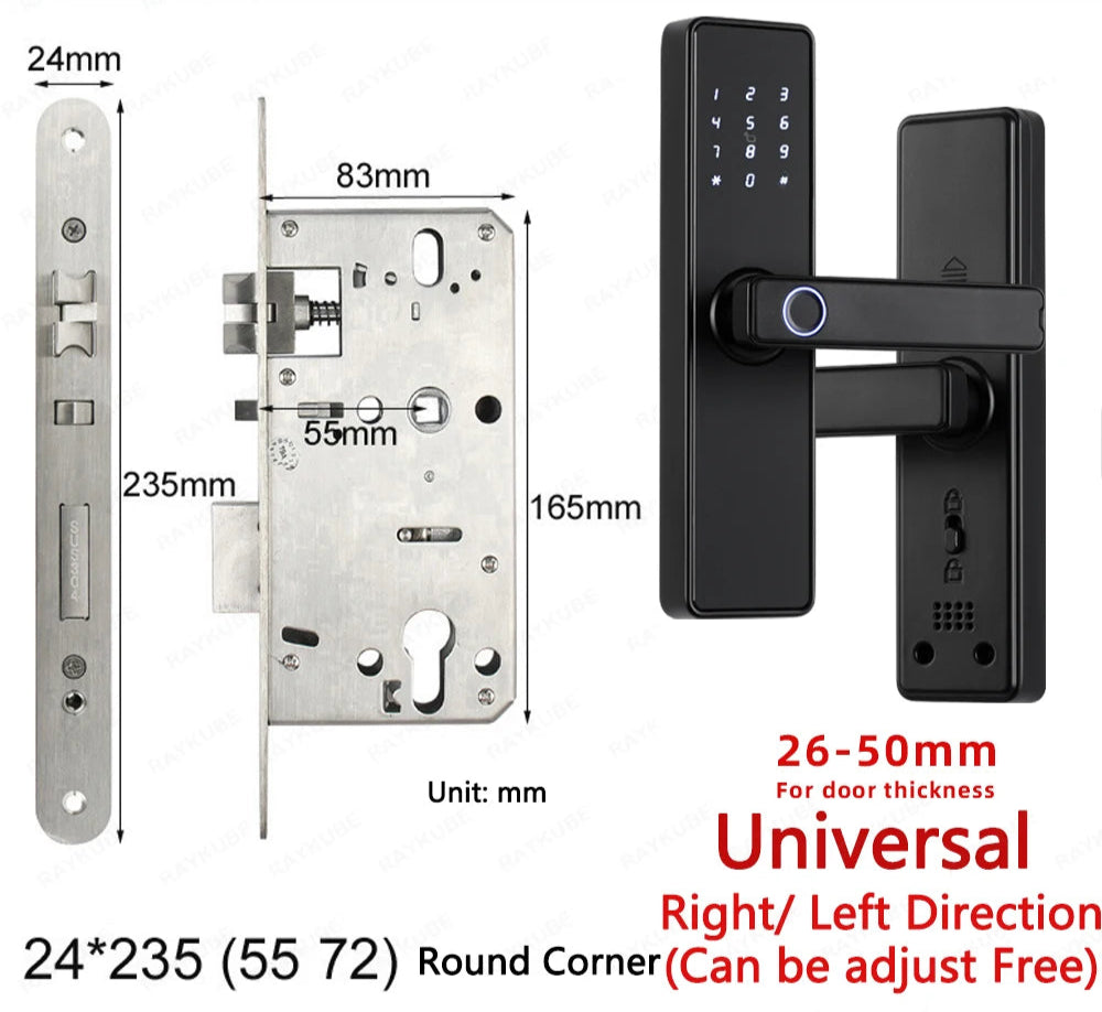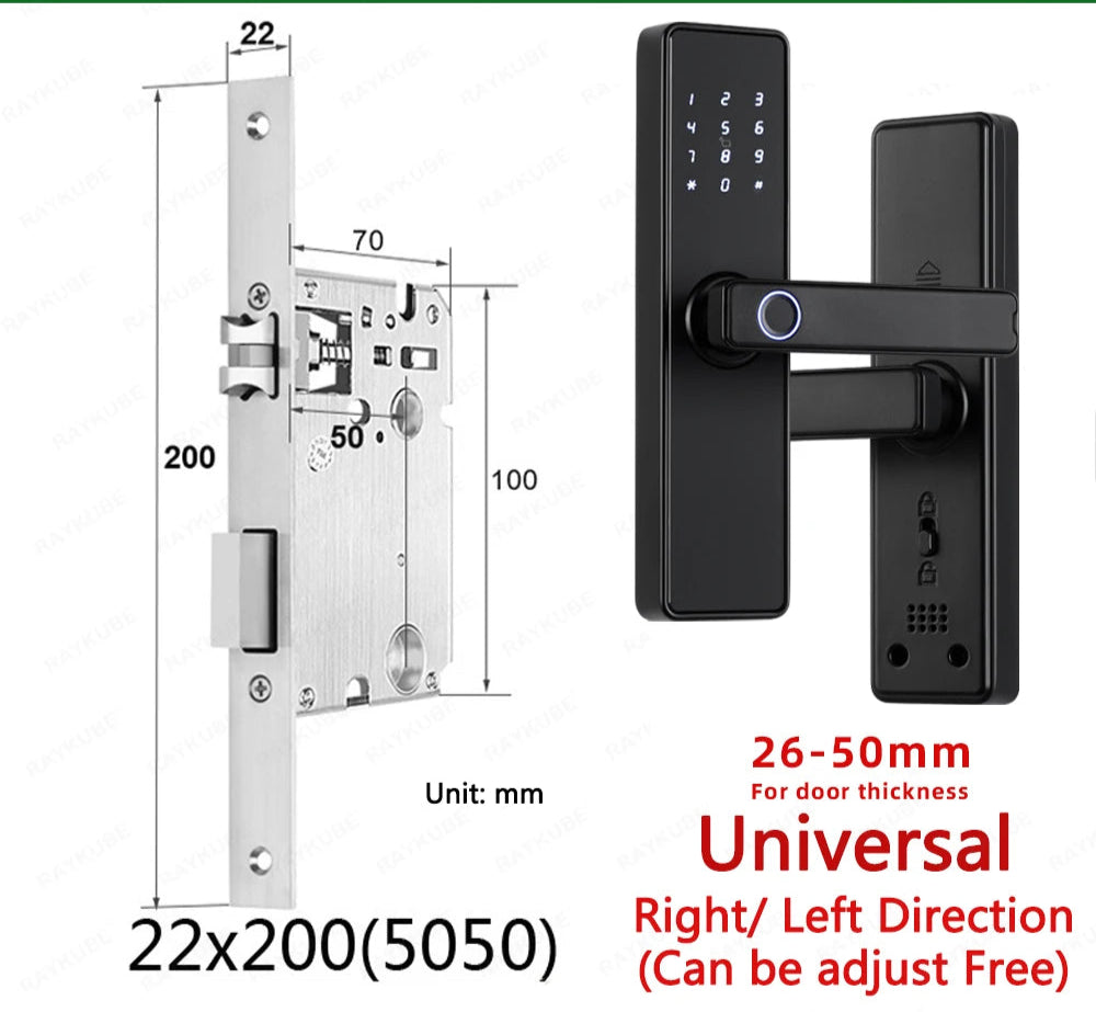 Das Schloss ist aus robustem Zinklegierungsmaterial gefertigt und für Türen mit einer Dicke von 26 bis 50 mm geeignet. Die Griffrichtung ist reversibel, sodass das Schloss sowohl für links- als auch für rechtsanschlagende Türen verwendet werden kann. Die Stromversorgung erfolgt über trockene Batterien, wodurch eine einfache und flexible Installation gewährleistet ist.