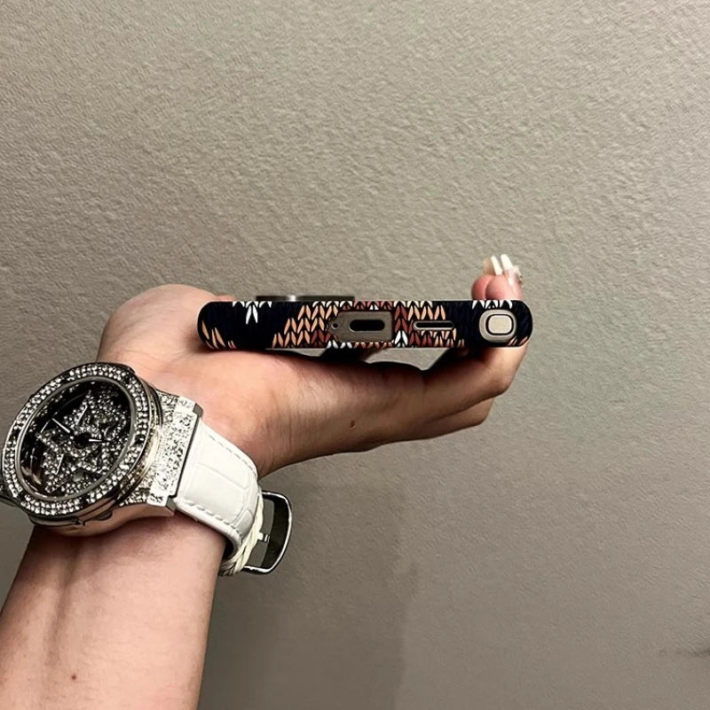 Das schicke Schlangenmuster und die strukturierte Carbon-Optik verleihen dem Smartphone einen modernen, hochwertigen Look. Der Kamerabereich ist durch einen Metallrahmen und erhöhte Kanten geschützt, um Kratzer und Stöße zu verhindern. Die Hülle unterstützt kabelloses MagSafe-Laden, ohne die Funktionalität zu beeinträchtigen.