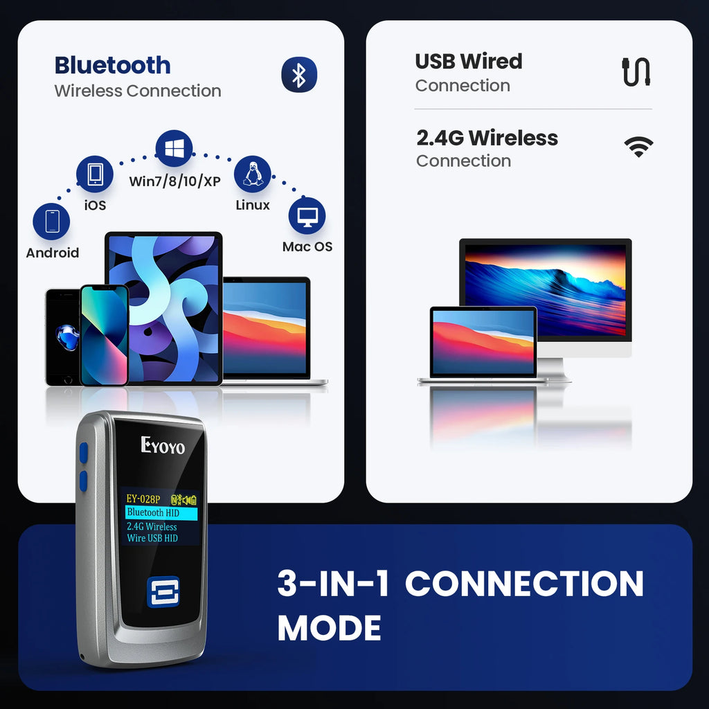 Der tragbare Barcode‑Scanner mit 3‑in‑1 Verbindung (Bluetooth, 2,4 GHz Wireless & USB) ist eine vielseitige Lösung für das Erfassen von 1D‑ und 2D‑Barcodes inklusive QR‑Code, Datenmatrix und PDF417 – ideal für Einzelhandel, Lager, Logistik, Bibliothek oder mobile Einsätze. Die optische Auflösung beträgt 300 × 300 dpi, das Scan‑Element‑Typ ist CMOS und die Geschwindigkeit liegt bei bis zu 200 Scans pro Sekunde. Der Scanner verbindet sich über USB, Bluetooth oder 2,4 GHz Funkübertragung und ist auch für mobile Zahlungen oder POS‑Systeme geeignet.