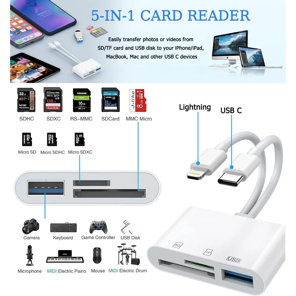 Der SD-Kartenleser für iPhone, iPad, USB-C und Lightning Dual Port ist ein vielseitiger Adapter, der den direkten Zugriff auf SD- und Micro-SD-Karten ermöglicht. Er unterstützt die Datenübertragung von USB 3.0 Geräten und ermöglicht den Import von Fotos und Videos direkt von Ihrer Kamera auf Ihr iPhone oder iPad.