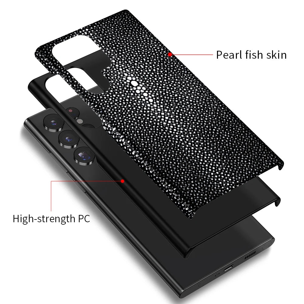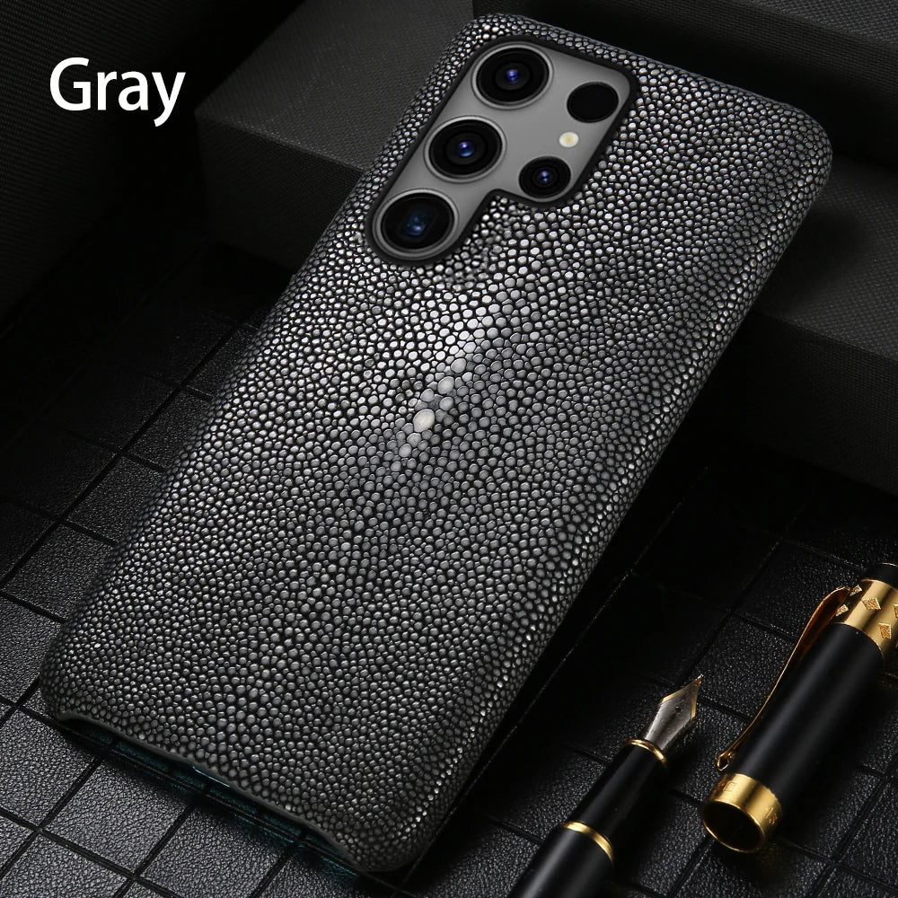 Diese hochwertige Handyhülle aus 100% echtem Pearl Gourami Leder bietet optimalen Schutz für Samsung S23, S24 und S25 Ultra Modelle. Das elegante, schlichte Design verleiht Ihrem Smartphone einen luxuriösen Look, während das Material stoßfest, kratzfest und staubdicht ist. Die Hülle ist leicht, rutschfest und schützt gleichzeitig vor Fingerabdrücken.