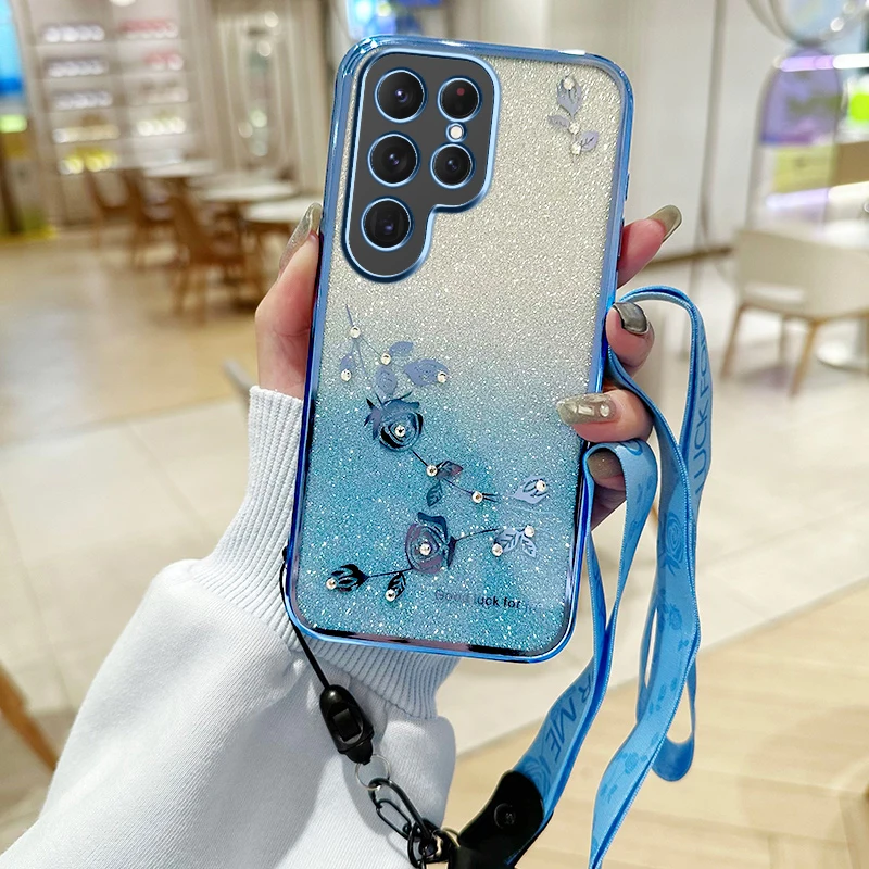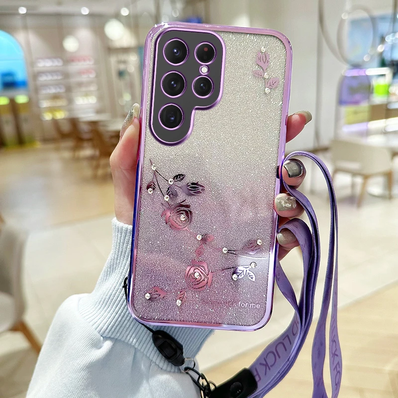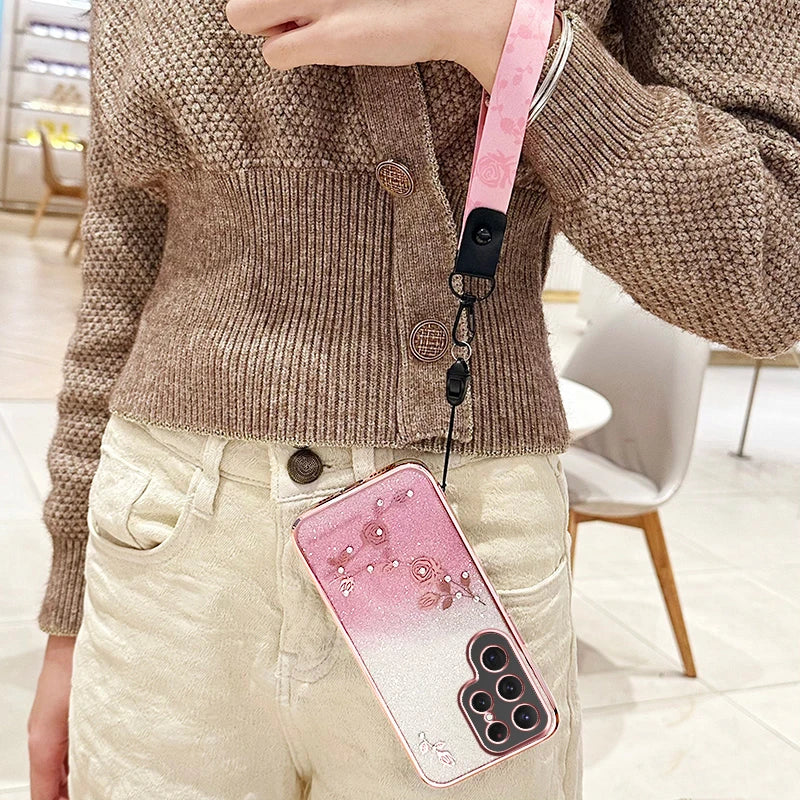 Ewige Blume Glitzer Hülle für Samsung S25 & S24 mit Crossbody-Träger