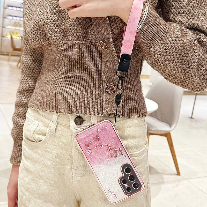 Das farbverlaufende Glitzerdesign mit feinen Blumenakzenten sorgt für einen luxuriösen Look, während die integrierte Crossbody-Trageschlaufe praktischen Komfort bietet – ideal für den Alltag, Reisen oder Events. Die Hülle ist stoßfest und bewahrt Ihr Handy sicher vor Beschädigungen bei versehentlichen Stürzen.
