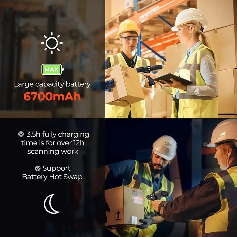 Je nach Variante ist ein Zebra SE4710 oder SE4850 Barcode-Scanner integriert. Beide Module unterstützen die Erkennung von 1D- und 2D-Barcodes mit hoher Geschwindigkeit (bis zu 200 Scans pro Sekunde). Das Gerät eignet sich für das Scannen auf größere Entfernungen – perfekt für Anwendungen im Hochregallager oder in der Versandlogistik.