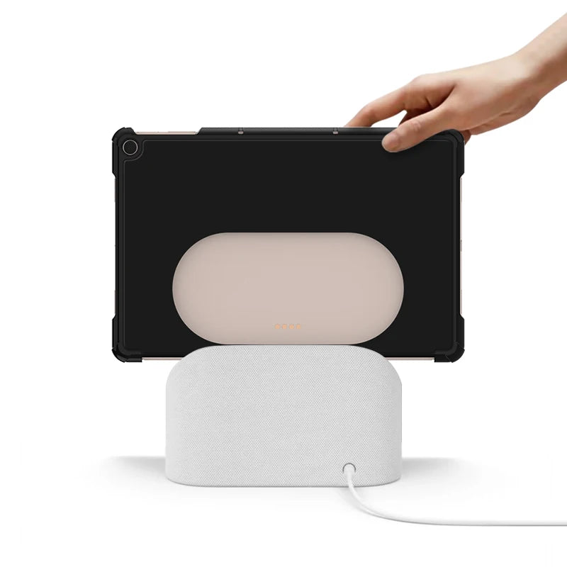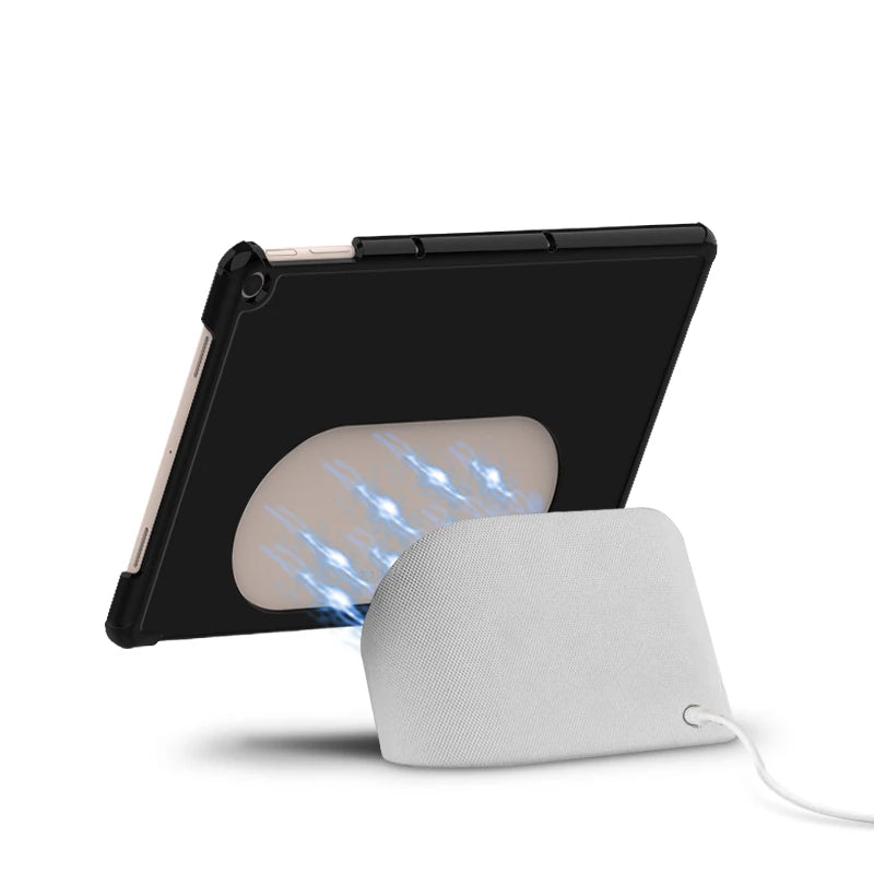 Die Hülle ist so konzipiert, dass sie die Nutzung einer kompatiblen Ladelautsprecherbasis unterstützt, wodurch das Aufladen und Musikhören gleichzeitig möglich ist. Alle Anschlüsse, Tasten und Kameras bleiben durch präzise Aussparungen leicht zugänglich. Bitte beachten Sie, dass die auf den Produktbildern gezeigte Lautsprecherbasis und der Stift nur Requisiten sind und nicht im Lieferumfang enthalten sind. Im Paket enthalten ist eine schwarze Hartschale mit PU-Furnier für den zuverlässigen Schutz Ihres Tablets.