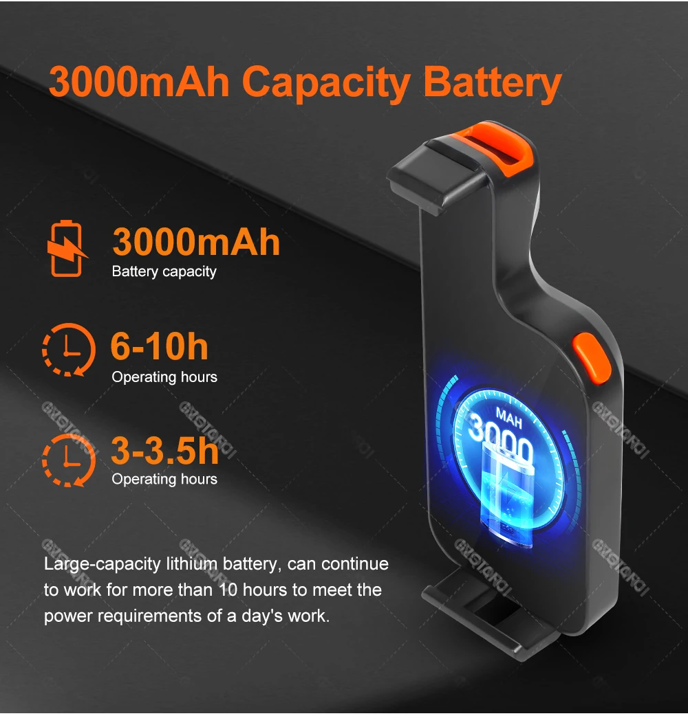 Ein weiterer Pluspunkt ist der integrierte 3000-mAh-Akku, der bis zu 6–10 Stunden durchgehenden Betrieb ermöglicht. Die Ladezeit beträgt nur etwa 3 Stunden. Somit eignet sich das Gerät auch für den Einsatz über einen gesamten Arbeitstag hinweg.