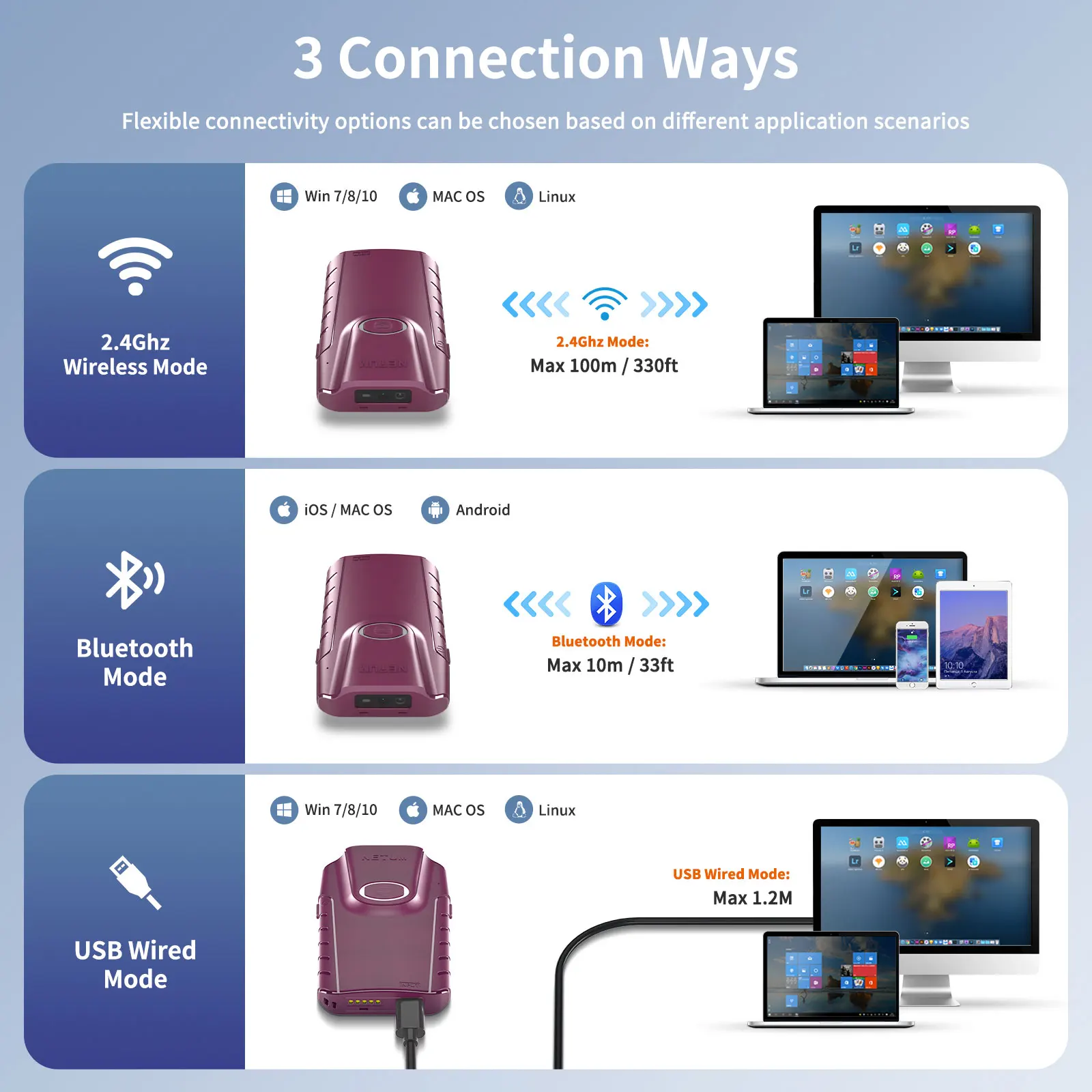 Der Scanner verfügt über eine drahtlose Bluetooth-Verbindung und eine USB-Schnittstelle für maximale Flexibilität. Er lässt sich problemlos mit Android, iOS, Windows, macOS sowie Tablets, Smartphones und Kassensystemen verbinden. Sein kompaktes Design mit optionalem Rückseiten-Clip macht ihn besonders mobil und praktisch für den Einsatz unterwegs oder an der Kasse.