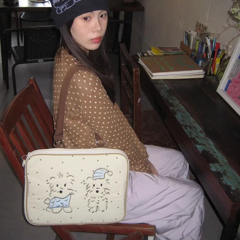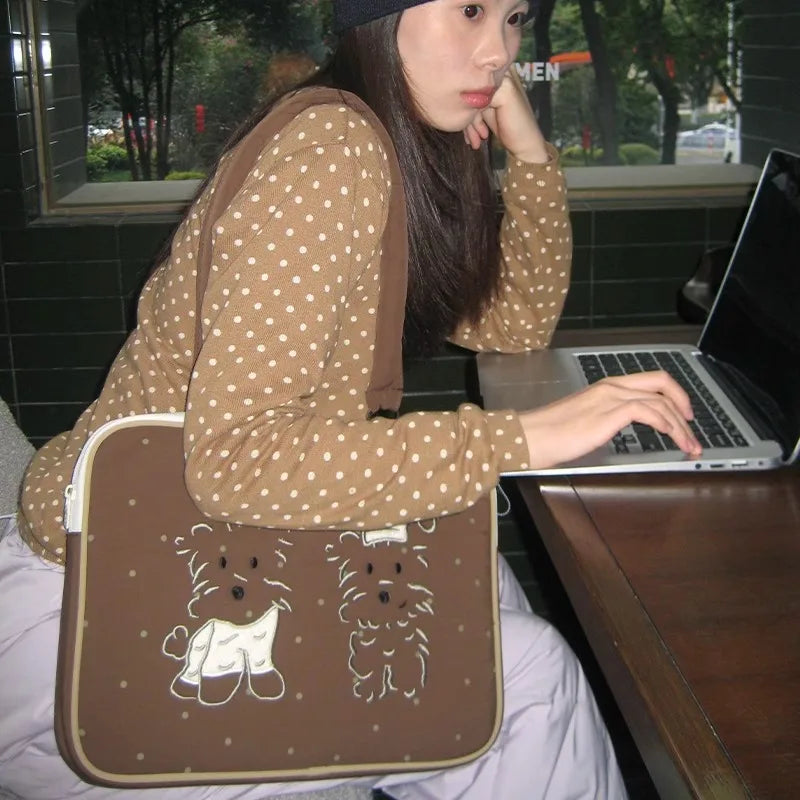 diese koreanische version der niedlichen laptop-umhängetasche bietet perfekten schutz und modisches design in einem. gefertigt aus strapazierfähigem polyester mit tierdruck-muster, kombiniert sie leichtigkeit, stil und funktionalität. das stoßfeste innenfutter schützt dein notebook zuverlässig vor kratzern, stößen und staub. der stabile reißverschluss sorgt für sicheres verschließen, während der verstellbare schulterriemen ein angenehmes tragen ermöglicht – ideal für schule, uni, arbeit oder reisen.
