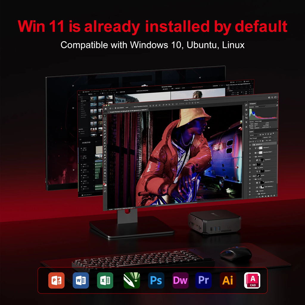 Der Mini-PC bietet vielfältige Anschlussmöglichkeiten, darunter 1x Gigabit Ethernet LAN, 2x USB 3.2, 2x USB 2.0, 2x HDMI-Anschlüsse und eine 3,5-mm-Audiobuchse. So können Sie problemlos mehrere Geräte wie Monitore, Tastaturen, Mäuse, Drucker, Überwachungskameras oder sogar eine Spielekonsole anschließen und gleichzeitig produktiv arbeiten oder spielen.
