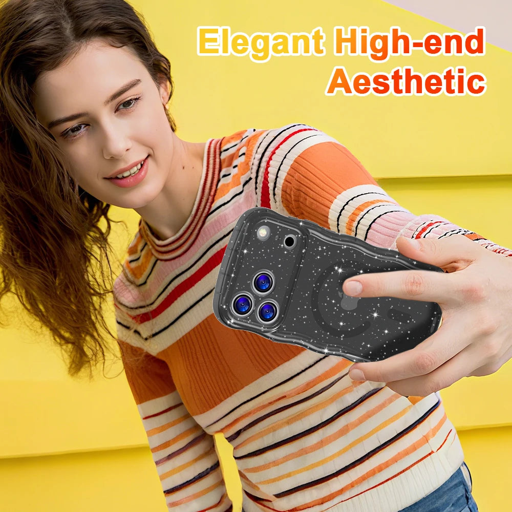 Das Design mit funkelndem Glitter und weichen Kanten verleiht Ihrem iPhone eine stilvolle und moderne Optik. Die Hülle ist magnetisch und ermöglicht eine einfache kabellose Aufladung, ohne die Hülle entfernen zu müssen.