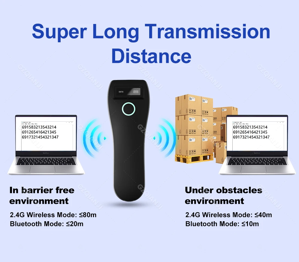 Dieser tragbare kabellose 2D-Barcode-Scanner vereint modernes Design mit leistungsstarker Technik und bietet eine zuverlässige Lösung für das Scannen verschiedenster Barcodeformate. Er ist mit einem klar lesbaren OLED-Display ausgestattet, das wichtige Informationen direkt anzeigt, sowie einem Vibrations-Feedback, das eine diskrete Bestätigung beim Scannen ermöglicht.