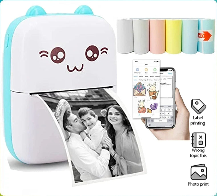 Der Mini Thermodrucker mit Katzenmotiv ist ein kompakter, tragbarer Foto- und Etikettendrucker, ideal für das persönliche Arbeitsmanagement und den mobilen Einsatz. Er druckt über Bluetooth mit einer Geschwindigkeit von bis zu 20 PPM und einer Auflösung von 203 dpi auf Thermopapier mit einer maximalen Breite von 50 mm. Der Drucker benötigt weder Tinte noch Doppeldruck, sondern arbeitet mit einfachem Walzenvorschub.