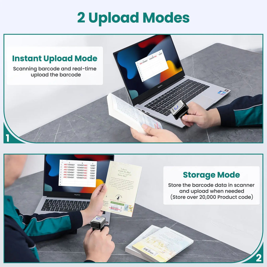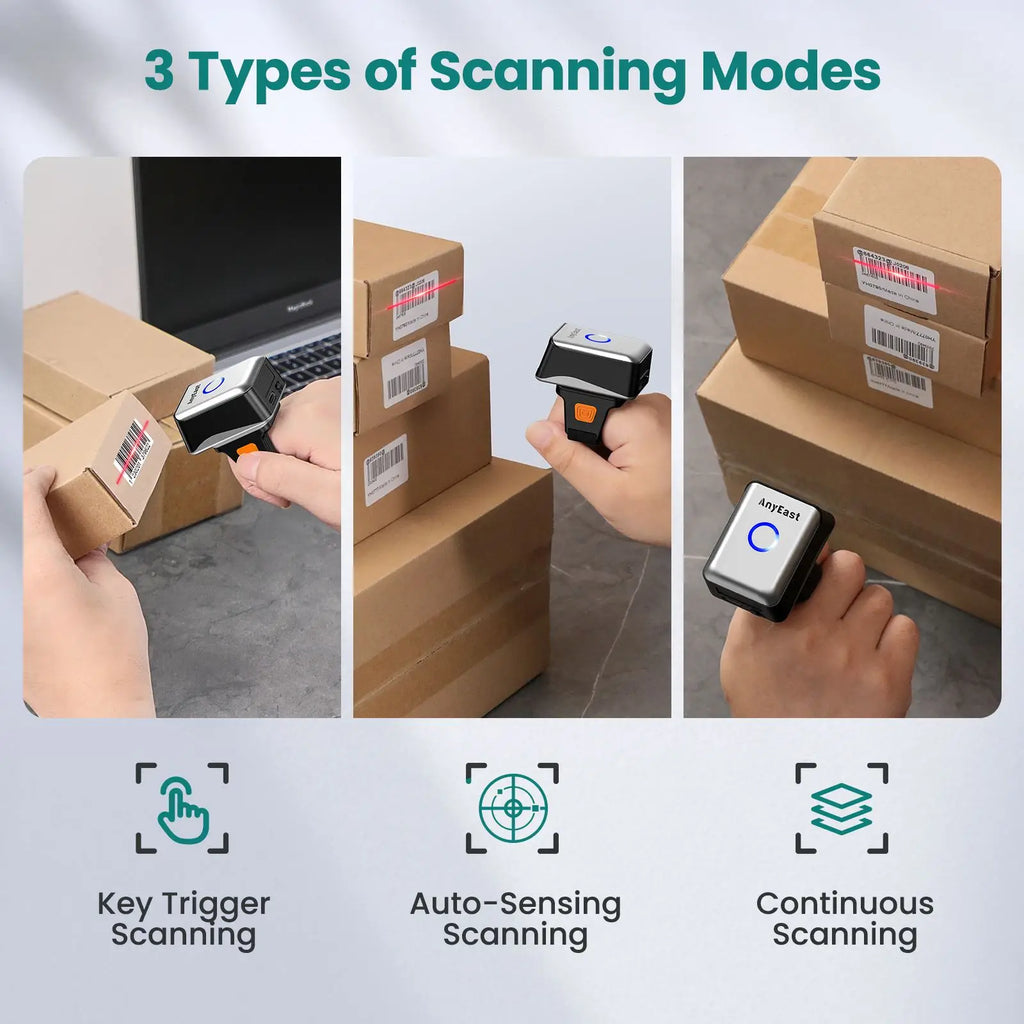 Der Scanner dekodiert zuverlässig 1D‑Barcodes wie EAN‑13, UPC‑A, Code 128, Code 39 u.v.m. Auch schwierige Codes wie beschädigte, reflektierende oder unscharfe Barcodes erkennt er präzise. Der Ring‑Scanner unterstützt drei Scanmodi: Trigger, Auto‑Sensing und kontinuierliches Scannen. Im Speicher‑Modus speichert er bis zu 20 000 Codes, die später aufs Gerät hochgeladen werden können.