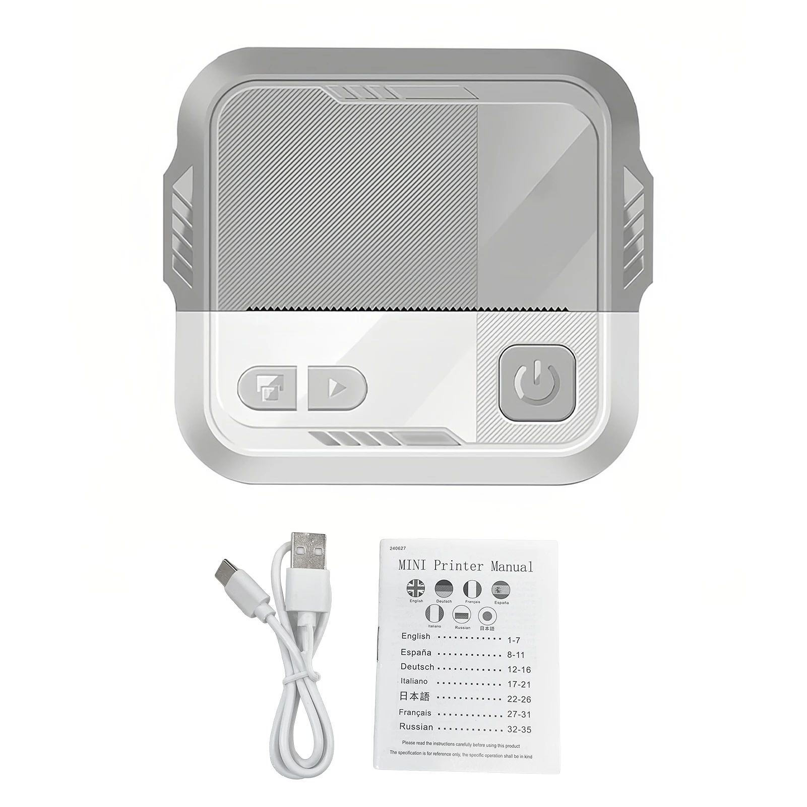 Lieferumfang: 1x Drucker, 1x Thermopapierrolle, 1x USB-C-Kabel, 1x Anleitung