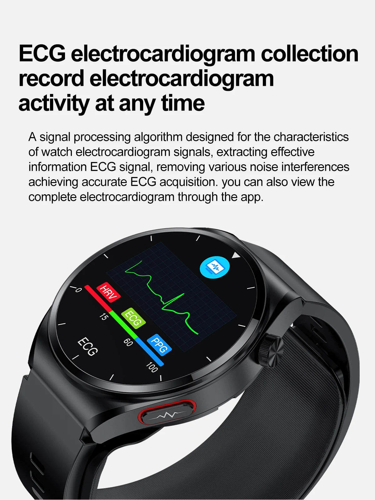 Das Gehäuse ist aus edlen Metallen gefertigt und das Ziffernblatt wird durch kratzfestes Saphirglas geschützt. Das Display misst 1,39 Zoll und ist ein hochauflösender AMOLED-Touchscreen mit 360 x 360 Pixeln. Die Uhr unterstützt viele Gesundheitsmetriken wie Herzfrequenz, Blutsauerstoff, Blutzucker, Blutdruck, Körpertemperatur, Stresslevel und die Messung der Atemfrequenz. Ein integriertes Elektrokardiogramm (ECG) und eine unabhängige Blutoxymetrie ermöglichen genaue medizinische Diagnosen direkt am Handgelenk.