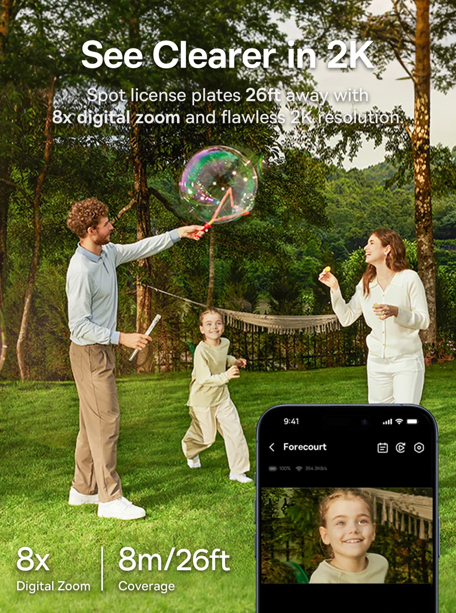 Ein weiterer Vorteil ist der lokale Speicherplatz von bis zu 512 GB, der ohne monatliche Gebühren genutzt werden kann. Die Daten werden durch AES+RSA-Verschlüsselung sicher gespeichert, sodass Ihre Privatsphäre jederzeit geschützt bleibt. Der digitale 8-fache Zoom ermöglicht eine genaue Detailansicht auch aus der Ferne.