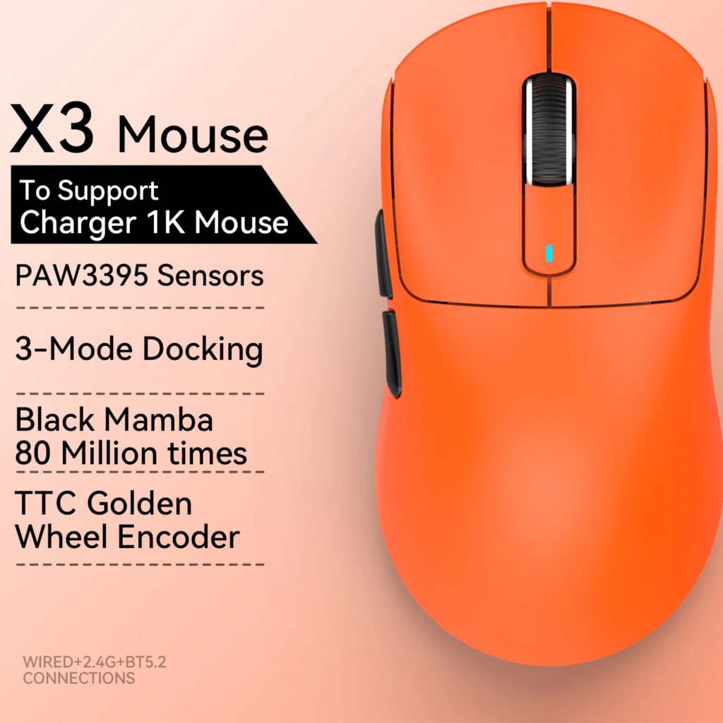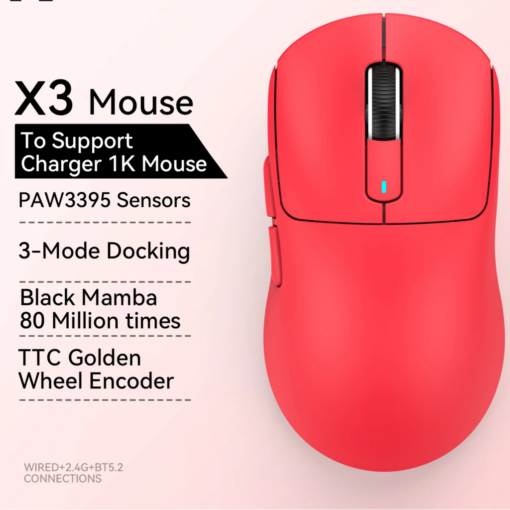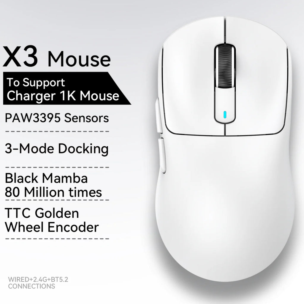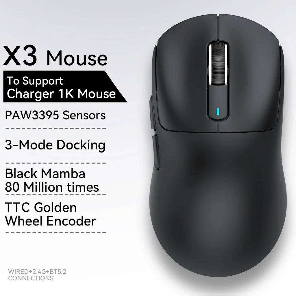 Die kabellose Gaming-Maus bietet eine präzise Steuerung dank des hochmodernen PixArt PAW3395 Sensors mit bis zu 26.000 DPI, 650 IPS Geschwindigkeit und einer Beschleunigung von 50 G. Sie ist mit einer Tri-Mode-Verbindung ausgestattet, die kabelgebundene, 2,4-GHz- und Bluetooth 5.2-Verbindungen unterstützt, was maximale Flexibilität für verschiedene Geräte wie Laptops, PCs und Macs ermöglicht. Die Maus ist extrem leicht und ergonomisch gestaltet, mit einem Gewicht von nur 49 g (X3) bzw. 59 g (X3pro), ideal für schnelle und präzise Bewegungen im Gaming oder Büroalltag.
