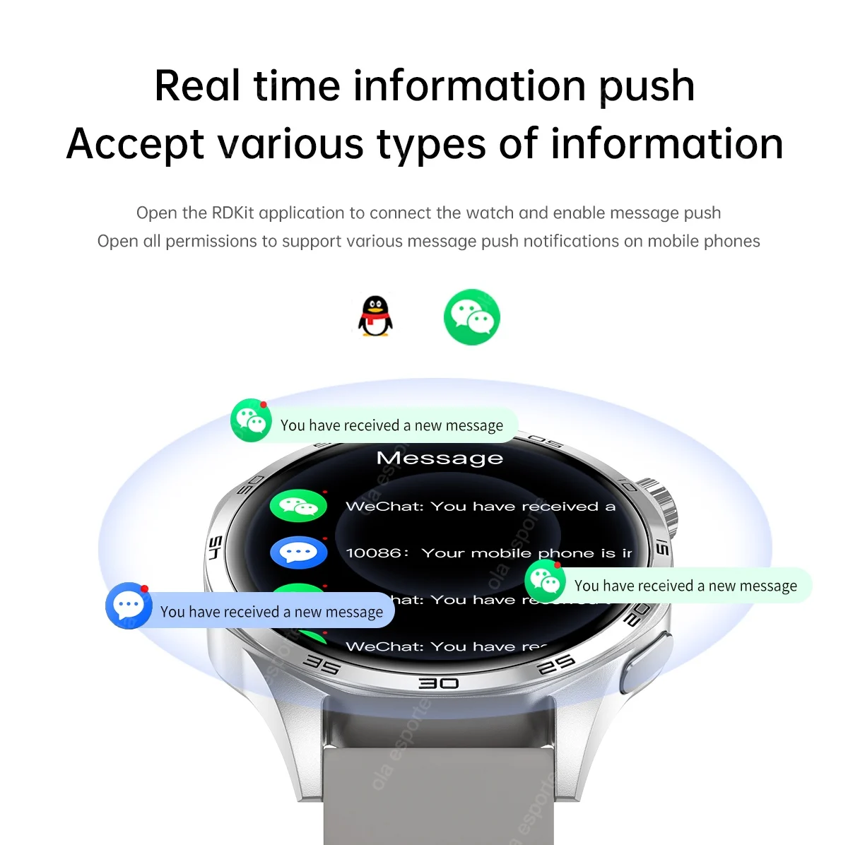 Die Bluetooth-Anruffunktion erlaubt es Ihnen, direkt über die Uhr zu telefonieren – perfekt für unterwegs oder im Büro. Intelligente Benachrichtigungen für Anrufe, Nachrichten und Apps wie WhatsApp, Facebook, Instagram, Telegram oder WeChat sorgen dafür, dass Sie stets verbunden bleiben.
