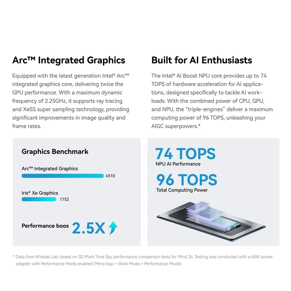 Mit bis zu 64 GB LPDDR5X RAM (8.400 MHz) und einer ultraschnellen 2TB PCIe 4.0 SSD gehört der Mini PC zu den schnellsten seiner Klasse. Der integrierte Intel Arc 140T Grafikchip liefert starke 8K-Grafikleistung mit bis zu 74 TOPS AI-Rechenleistung – ideal für Bildbearbeitung, Videoschnitt, 3D-Design oder komplexe KI-Anwendungen.