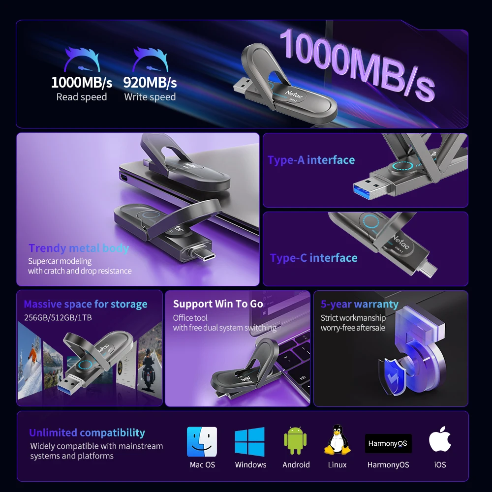 Dank der hohen Speicherkapazität können Sie Fotos, Videos, Dokumente und andere wichtige Daten sicher aufbewahren und problemlos zwischen verschiedenen Geräten übertragen. Das Gerät ist mit einer Vielzahl von Systemen kompatibel, einschließlich Windows, macOS, und vielen weiteren.